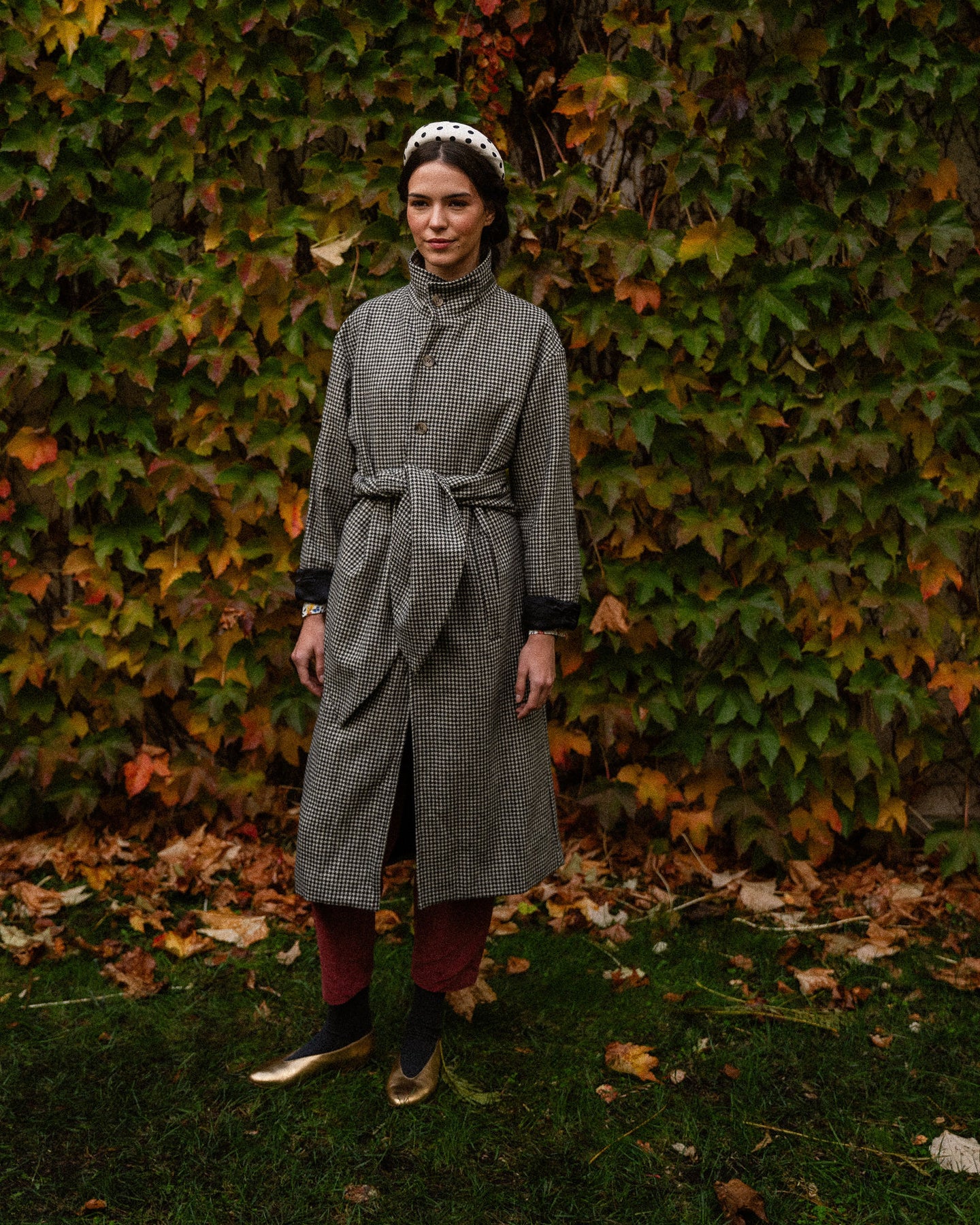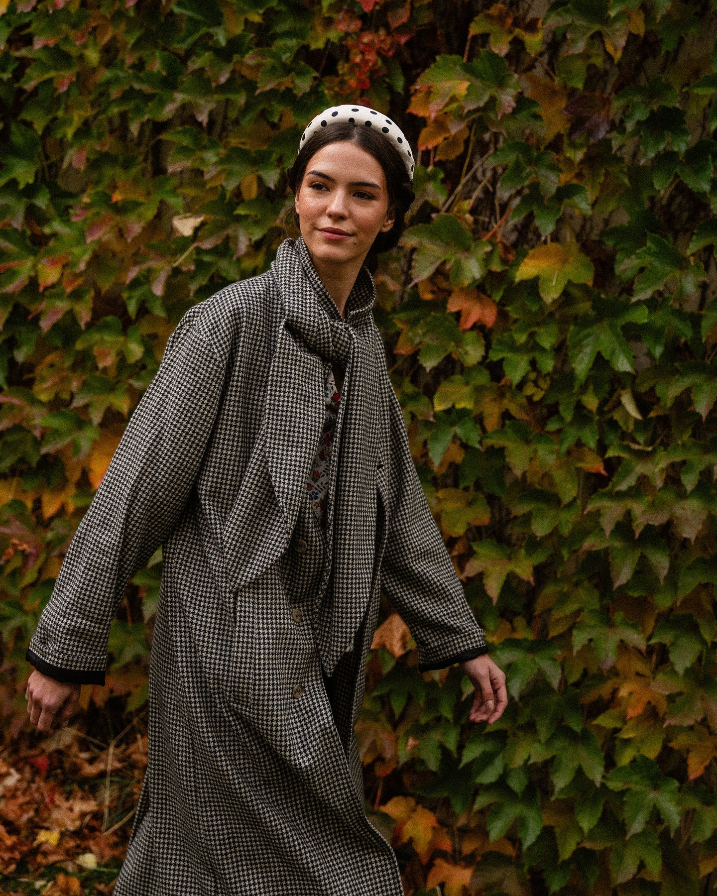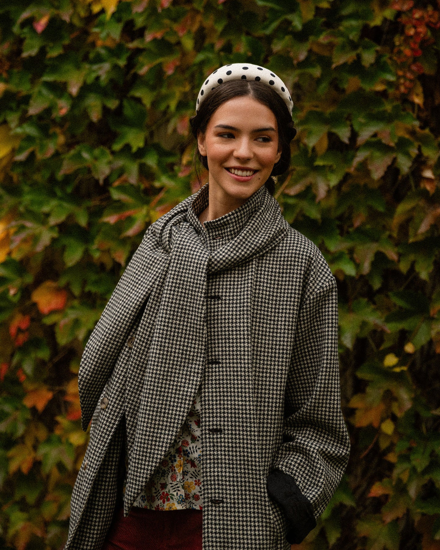 Abrigo discreto, elegante, especial. De corte recto, bolsillos y una lazada grande al cuello que se puede quitar.