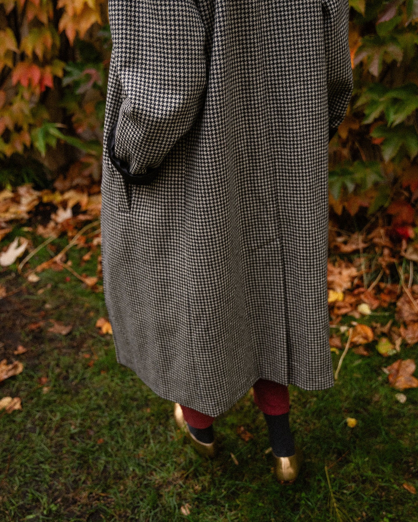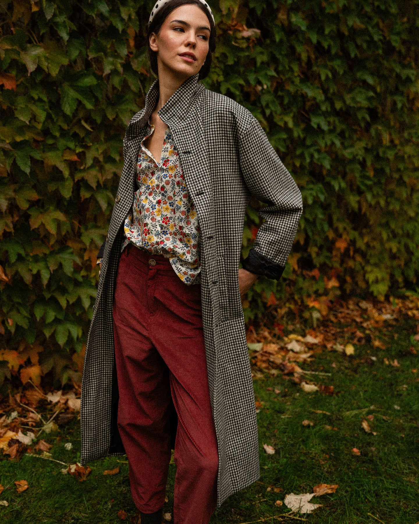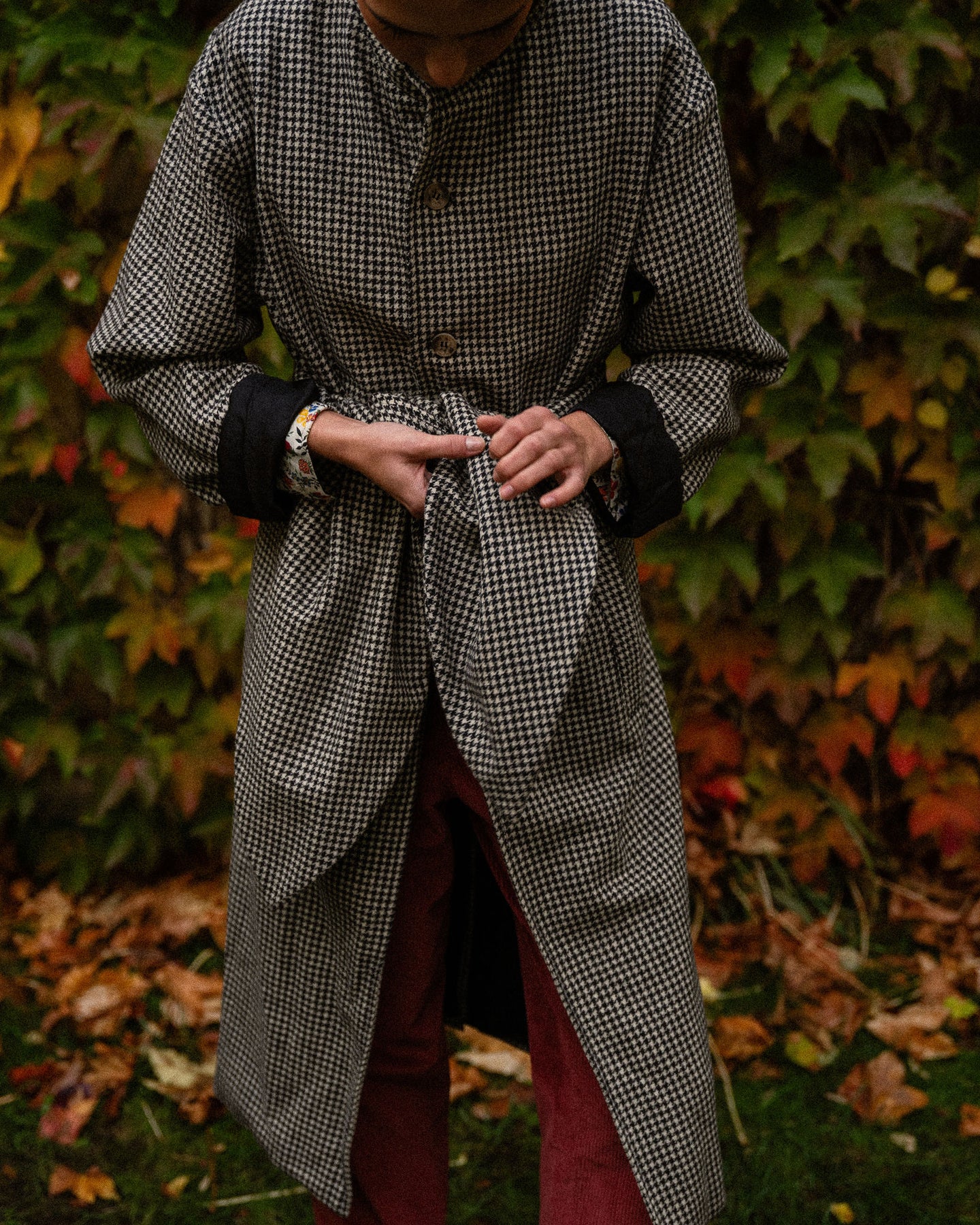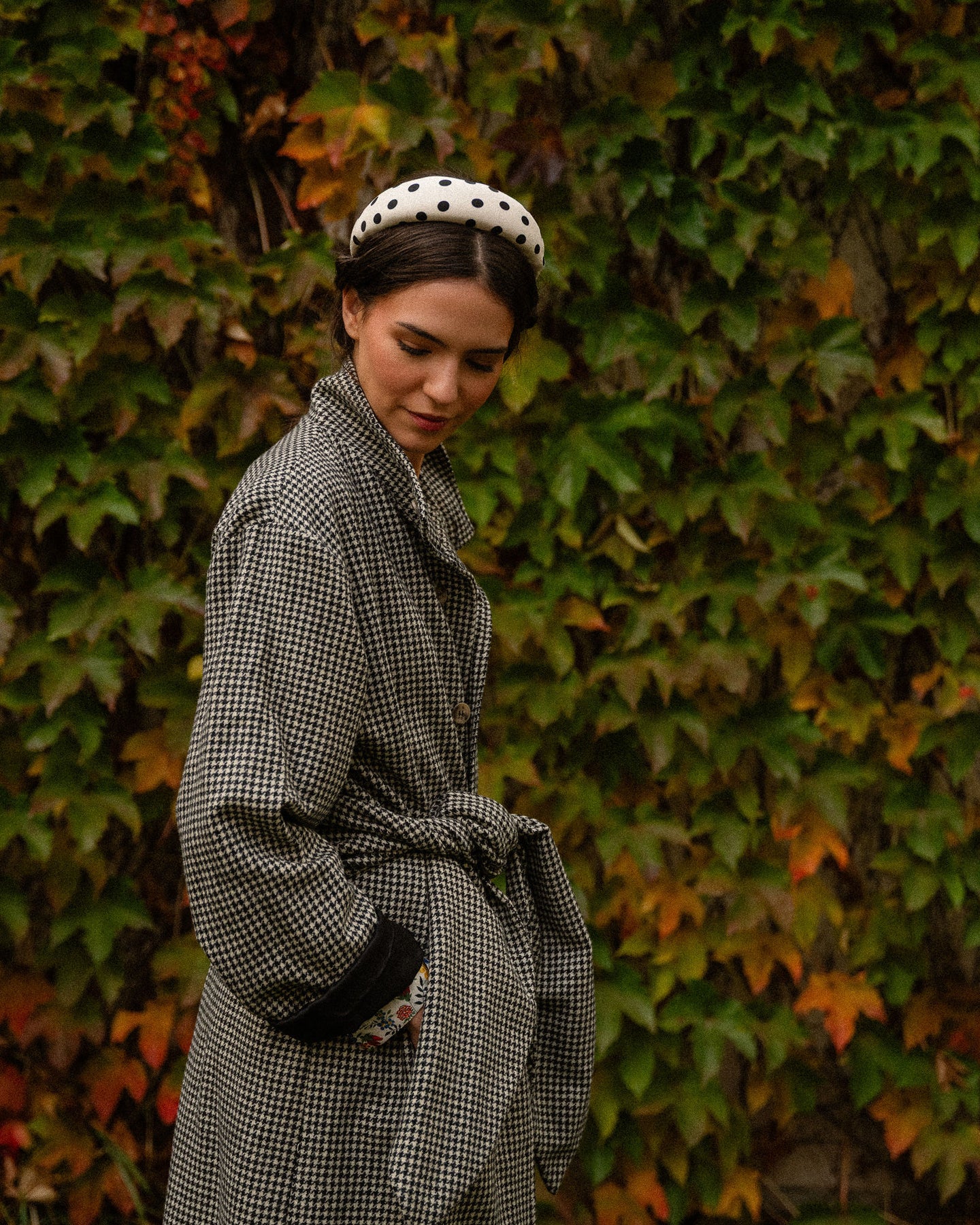 Abrigo discreto, elegante, especial. De corte recto, bolsillos y una lazada grande al cuello que se puede quitar.