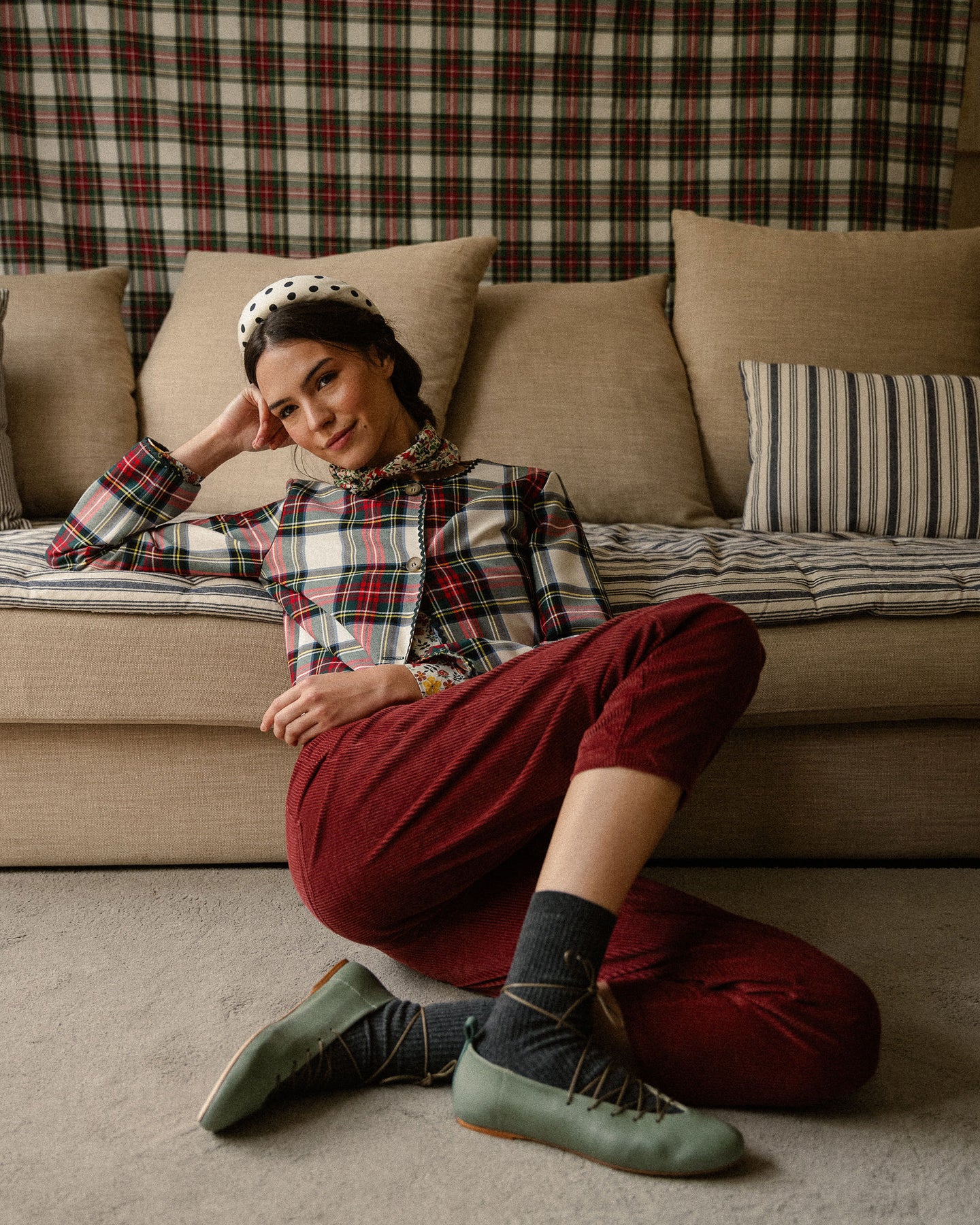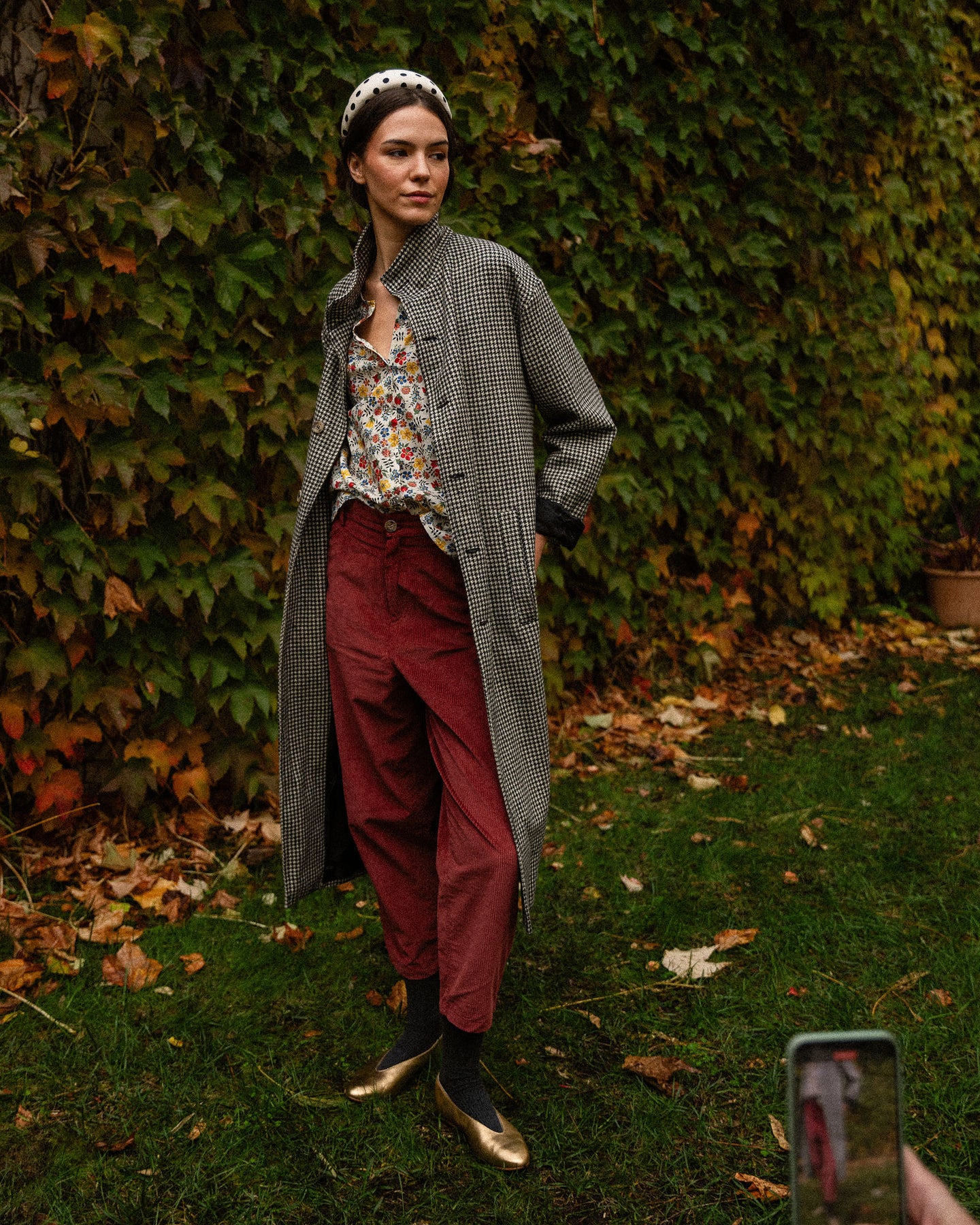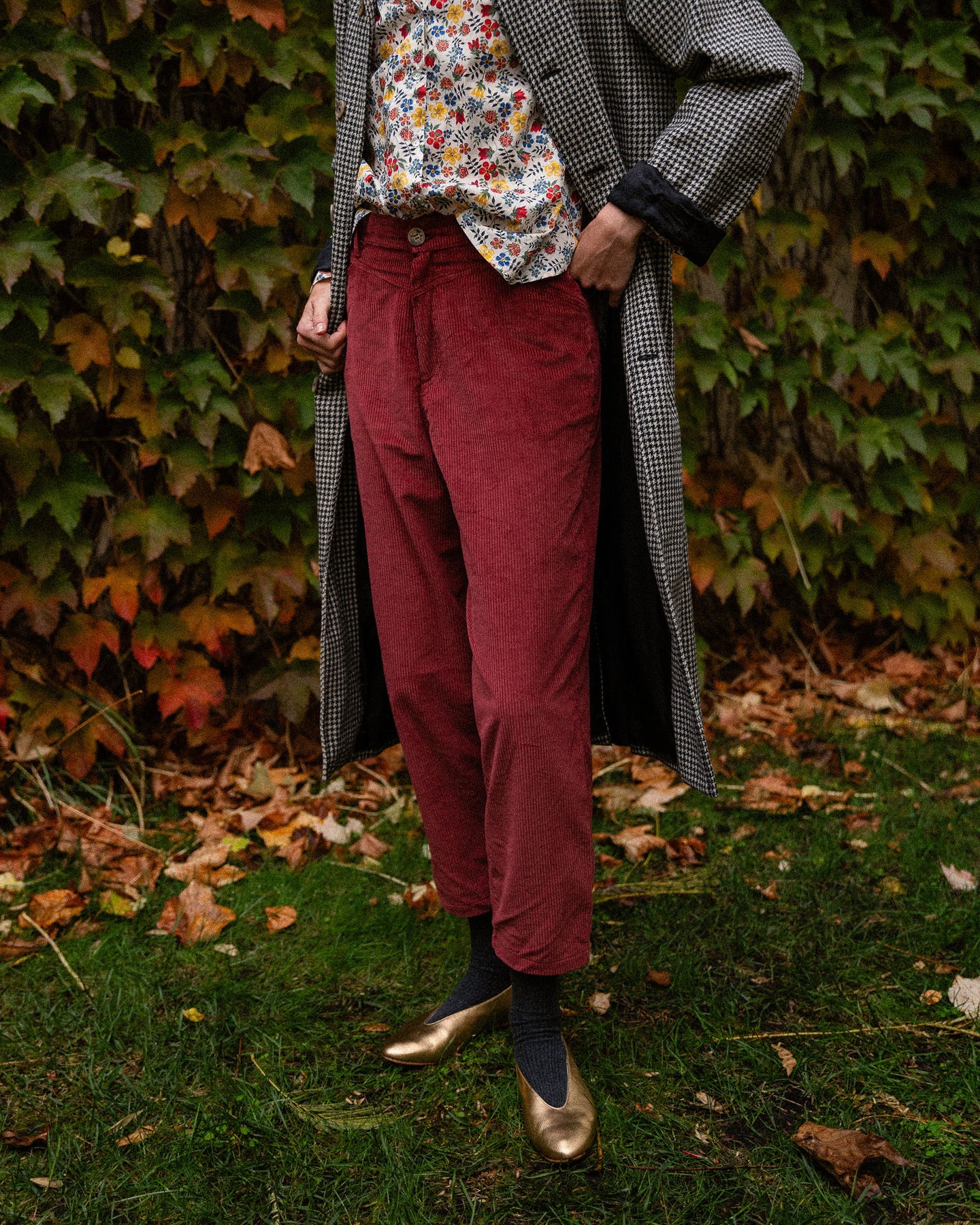Pantalón de corte baggy en pana gordita color marsala. Es ideal y lo podéis coger en vuestra talla normal o en una más si os apetece llevarlo más grande. Carlota y Lucía en las fotos llevan una 36.