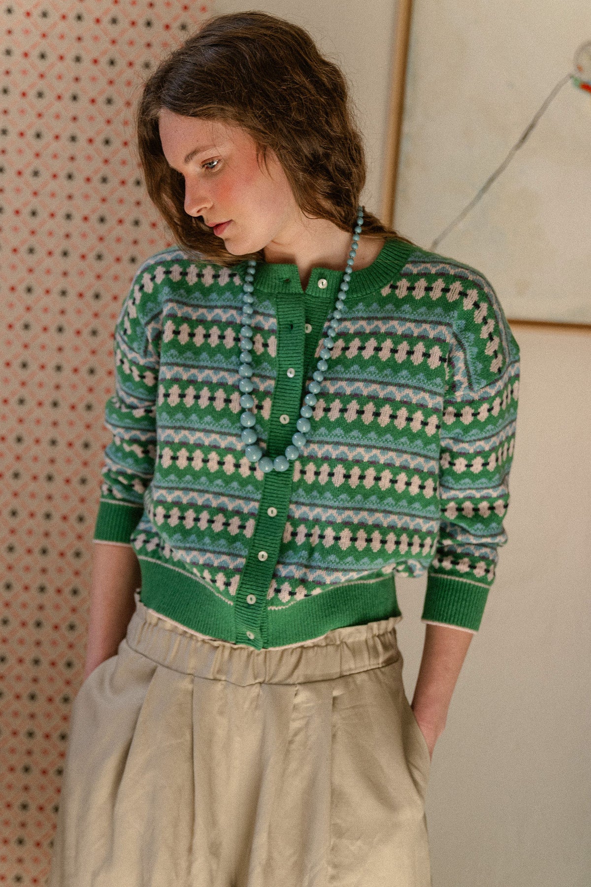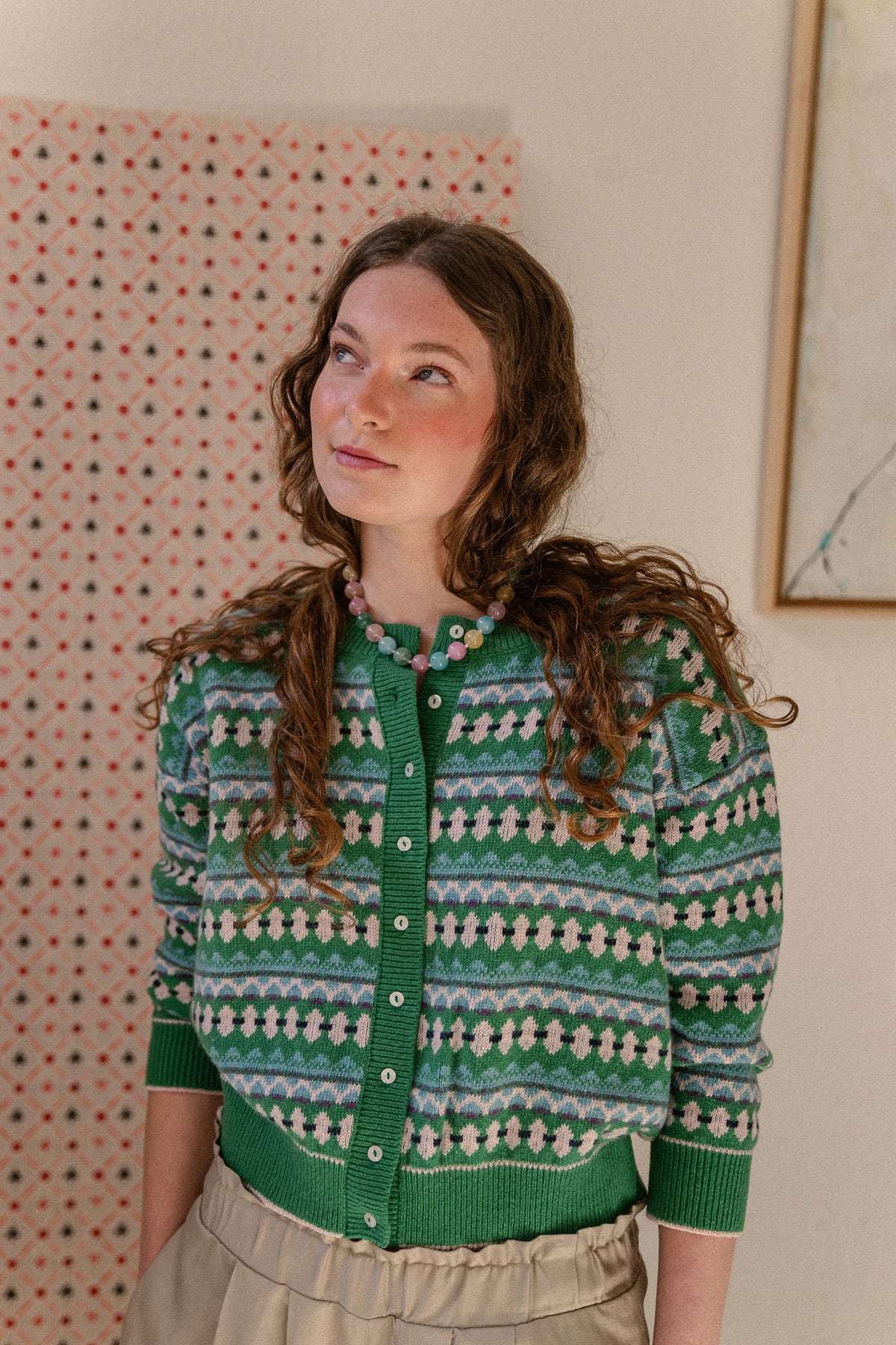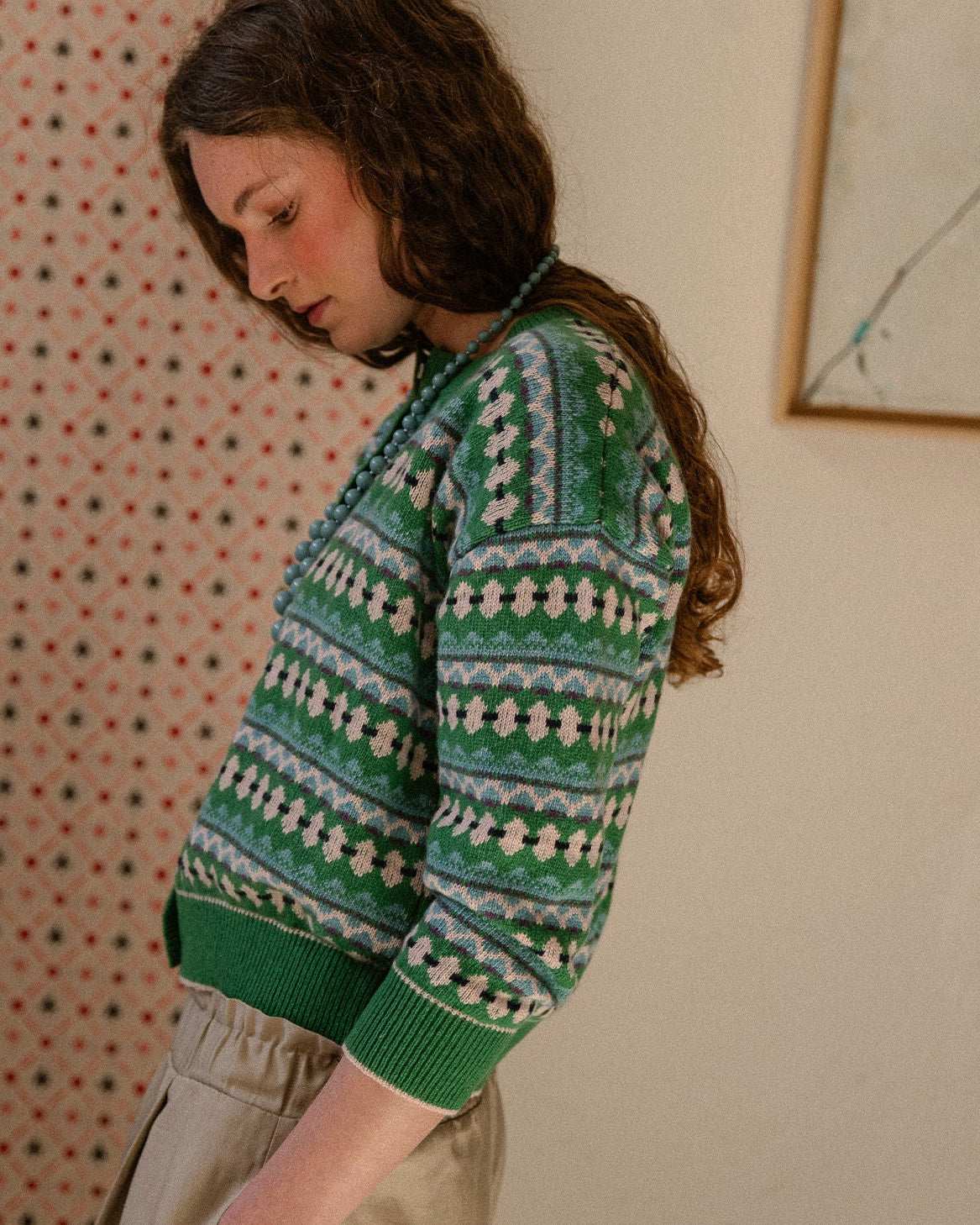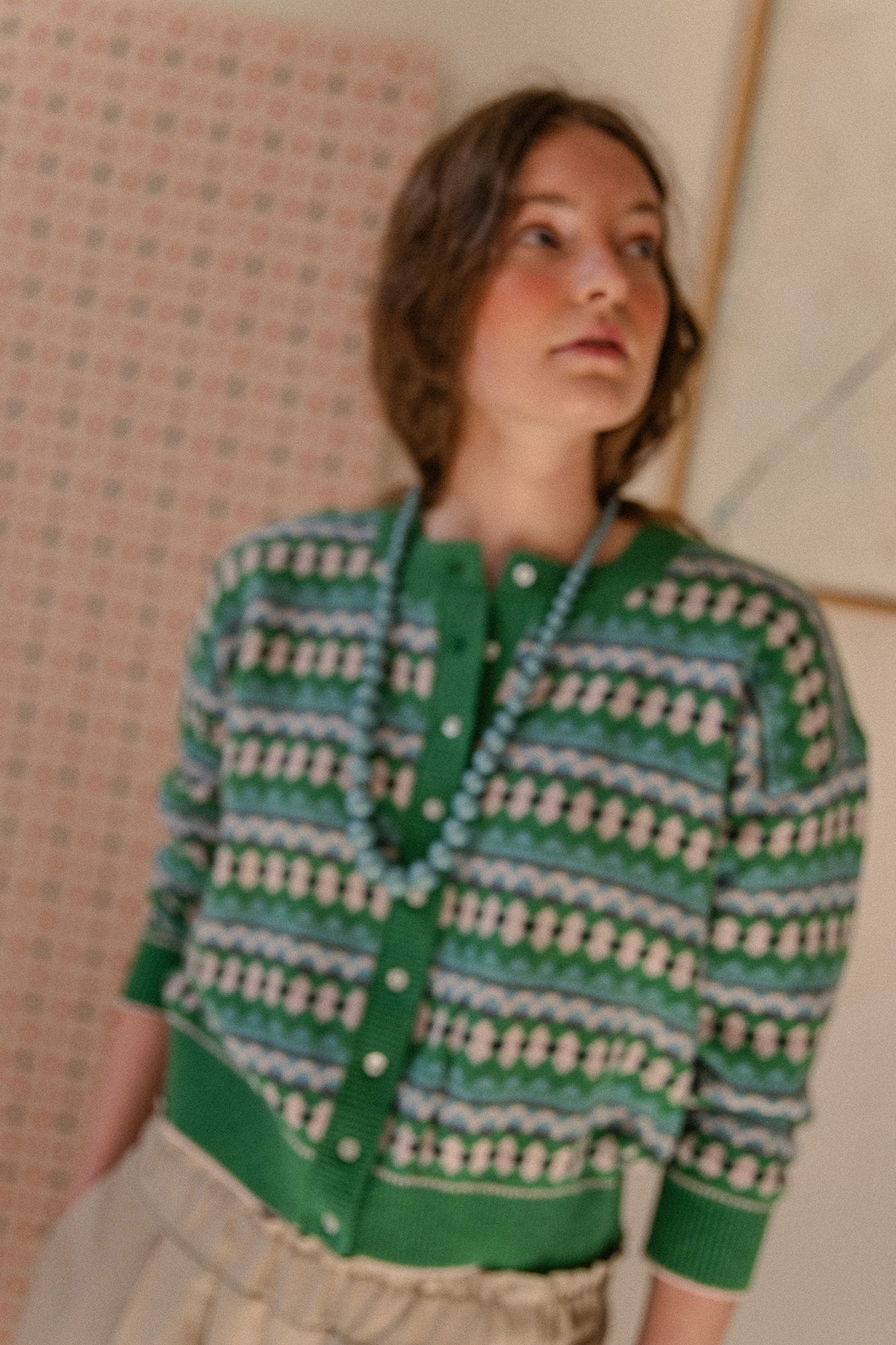 Rebeca verde de grecas en tonos nude, turquesa, marino y ligerísimos toques de malva que nos vuelve locas.