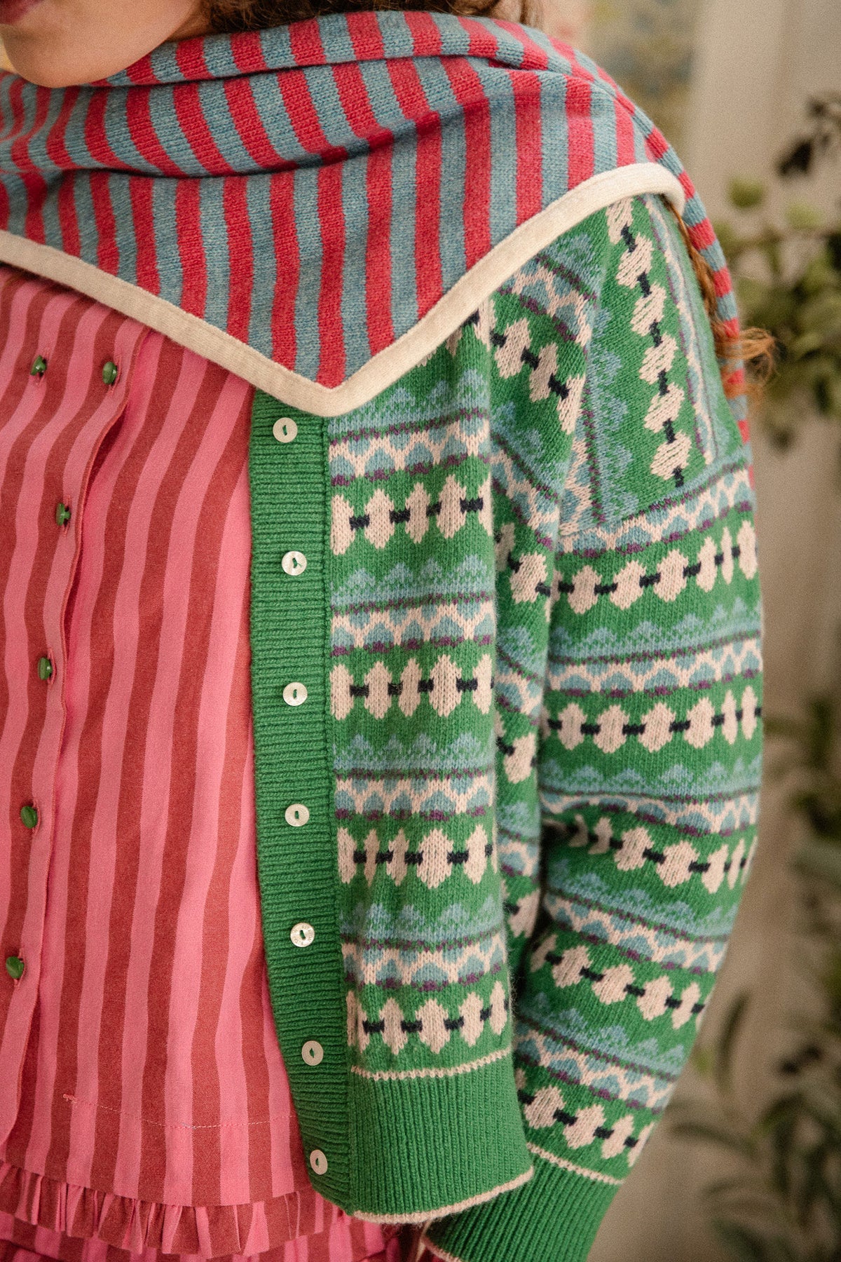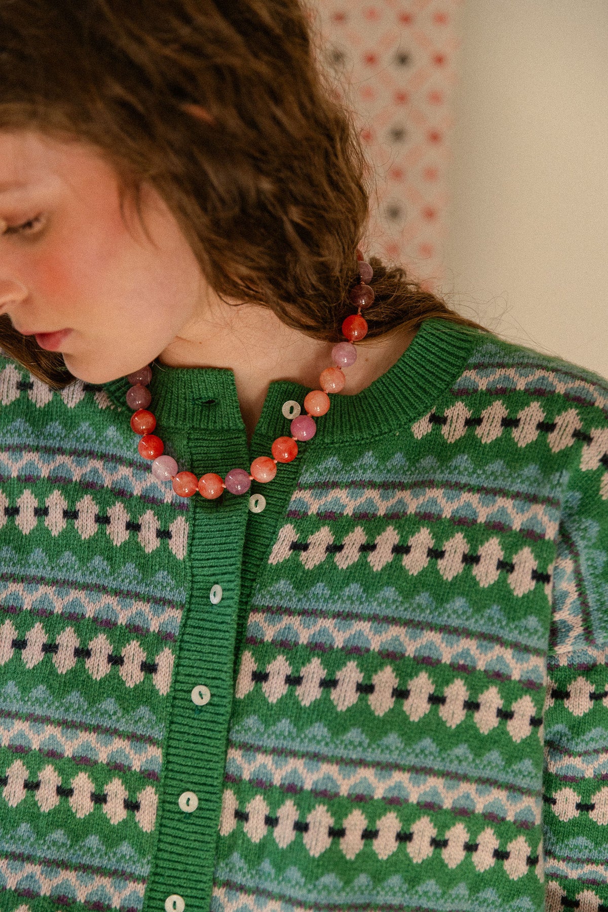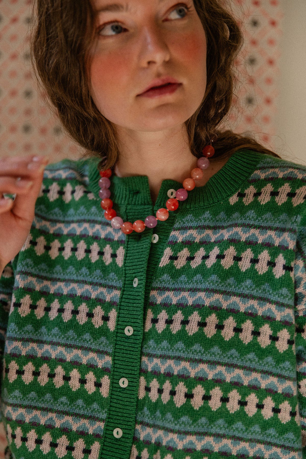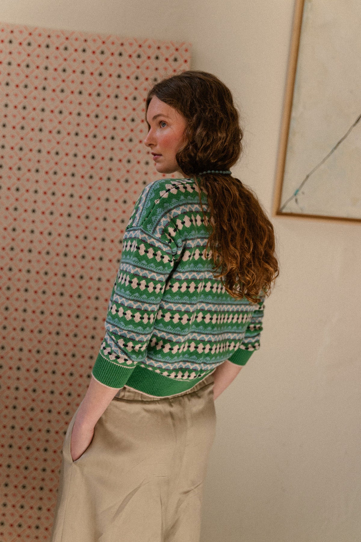 Rebeca verde de grecas en tonos nude, turquesa, marino y ligerísimos toques de malva que nos vuelve locas.
