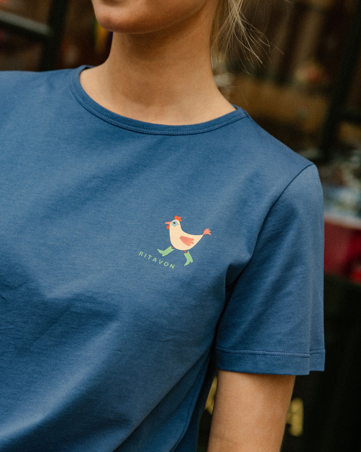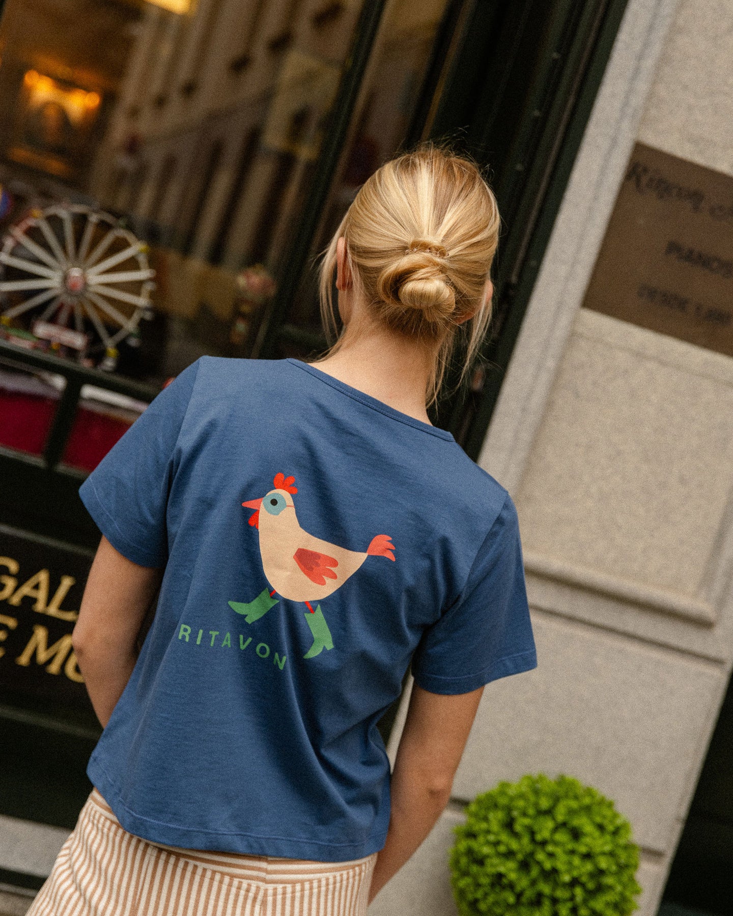 Camiseta muy genial de gallina en color azul oscuro. De manga corta, dibujo pequeño en el pecho y grande en la espalda, es una prenda súper primaveral para vuestros looks sport.