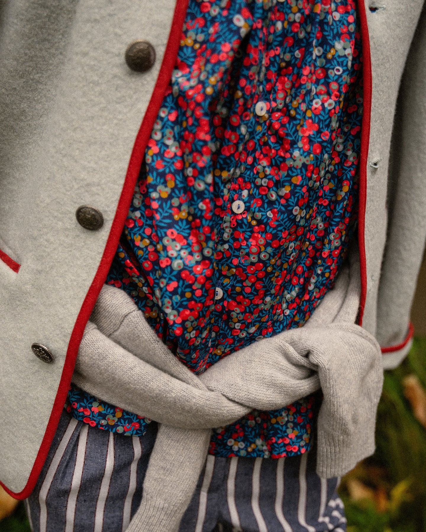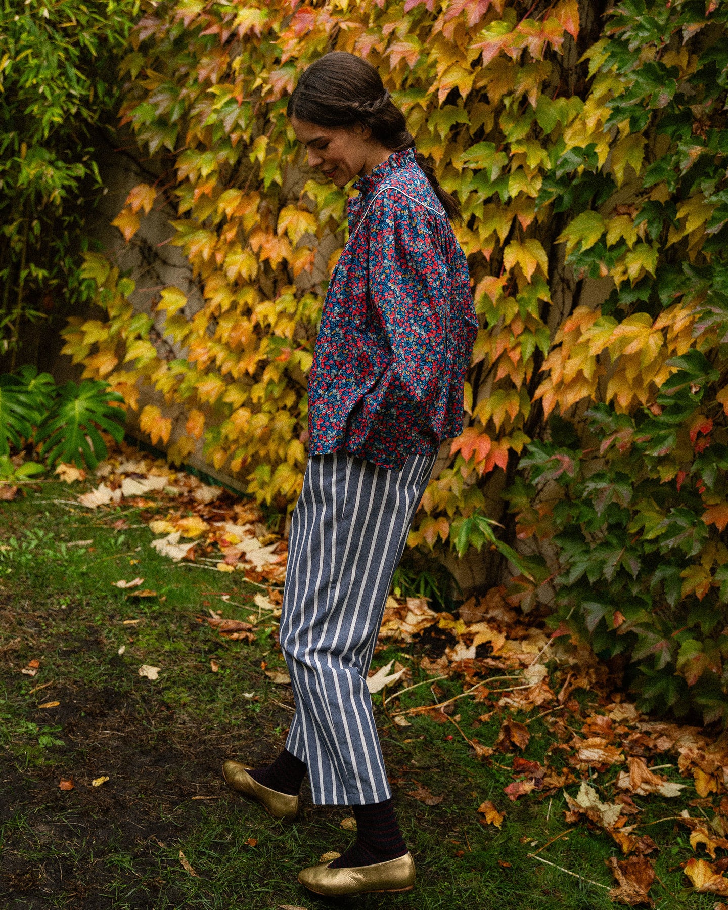 En un Liberty ideal de fondo oscurito y cerecitas rojas, esta blusa de patrón nuevo con canesú redondito, manga amplia sin puño y volante hacia arriba en el cuello es una monada que seguro os va a encantar para este invierno.