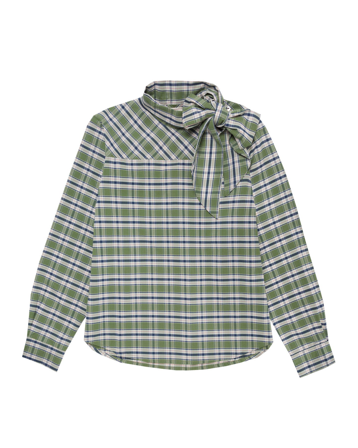 Una blusa Lisey de tartán verde con botoncitos pequeños en el hombro y lazada al cuello que os va a chiflar.