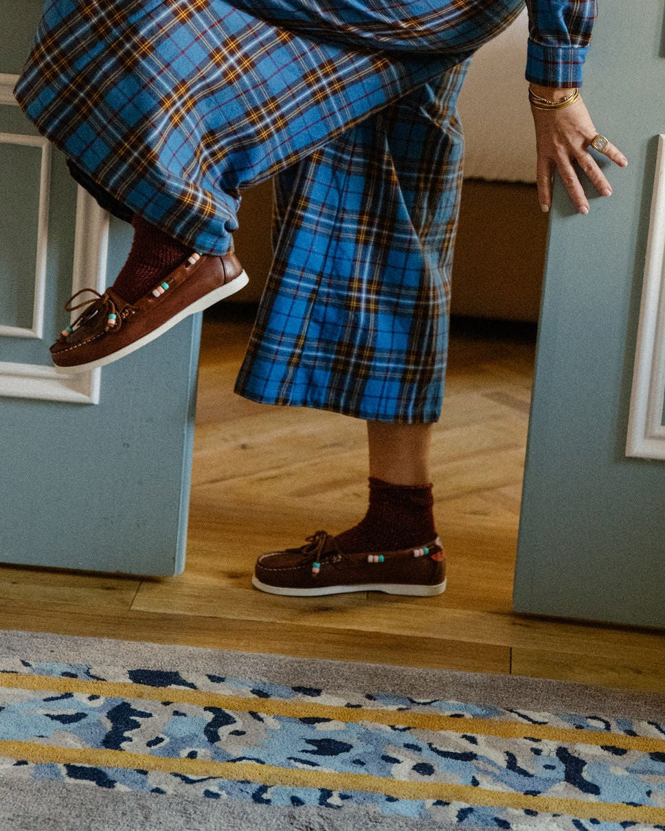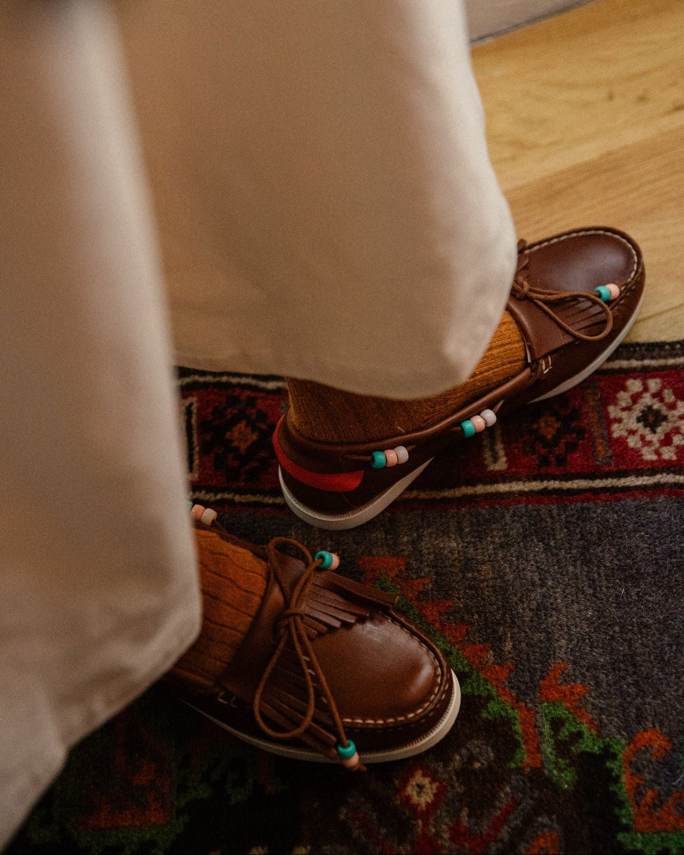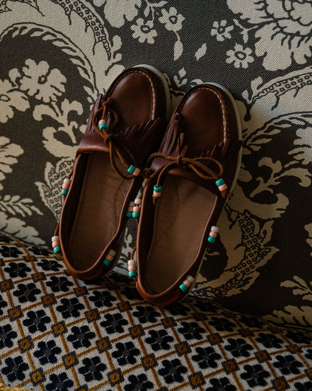 Herencia marinera con pespuntes cosidos a mano y lazo de cuero, a la que se suma un giro lúdico: lengüeta de flecos y el detalle icónico de la colaboración, las bolitas decorativas, colocadas una a una de forma artesanal. Cada par es ligeramente distinto, y en esas pequeñas variaciones vive su verdadera belleza: la del trabajo hecho con tiempo, cuidado y emoción.