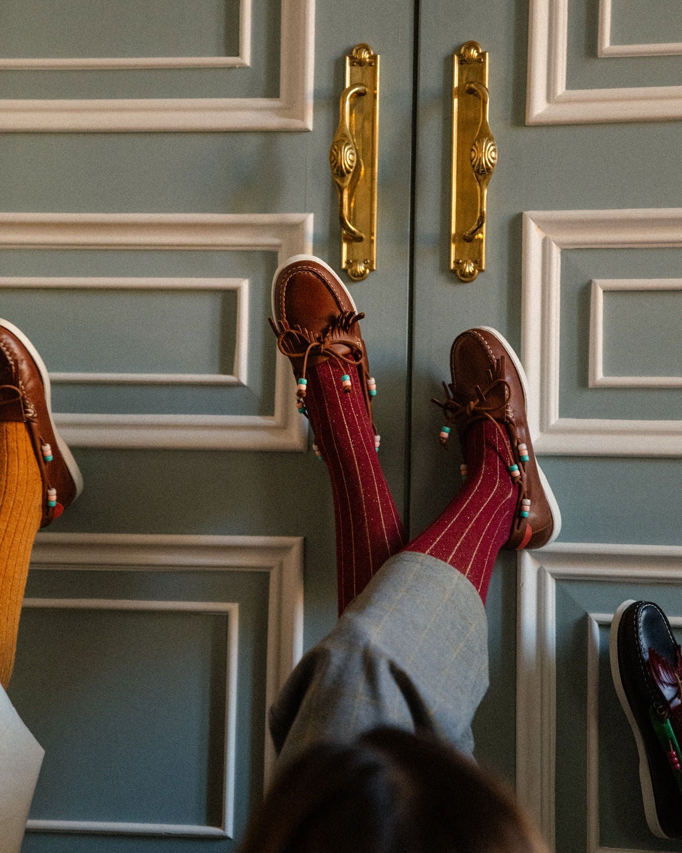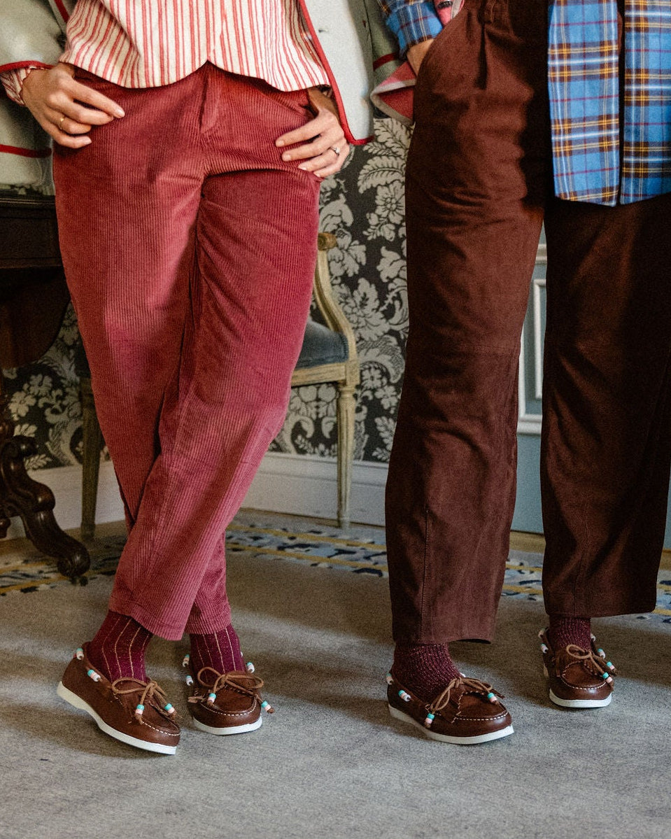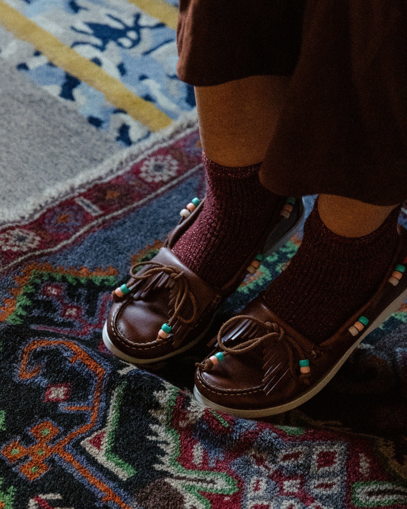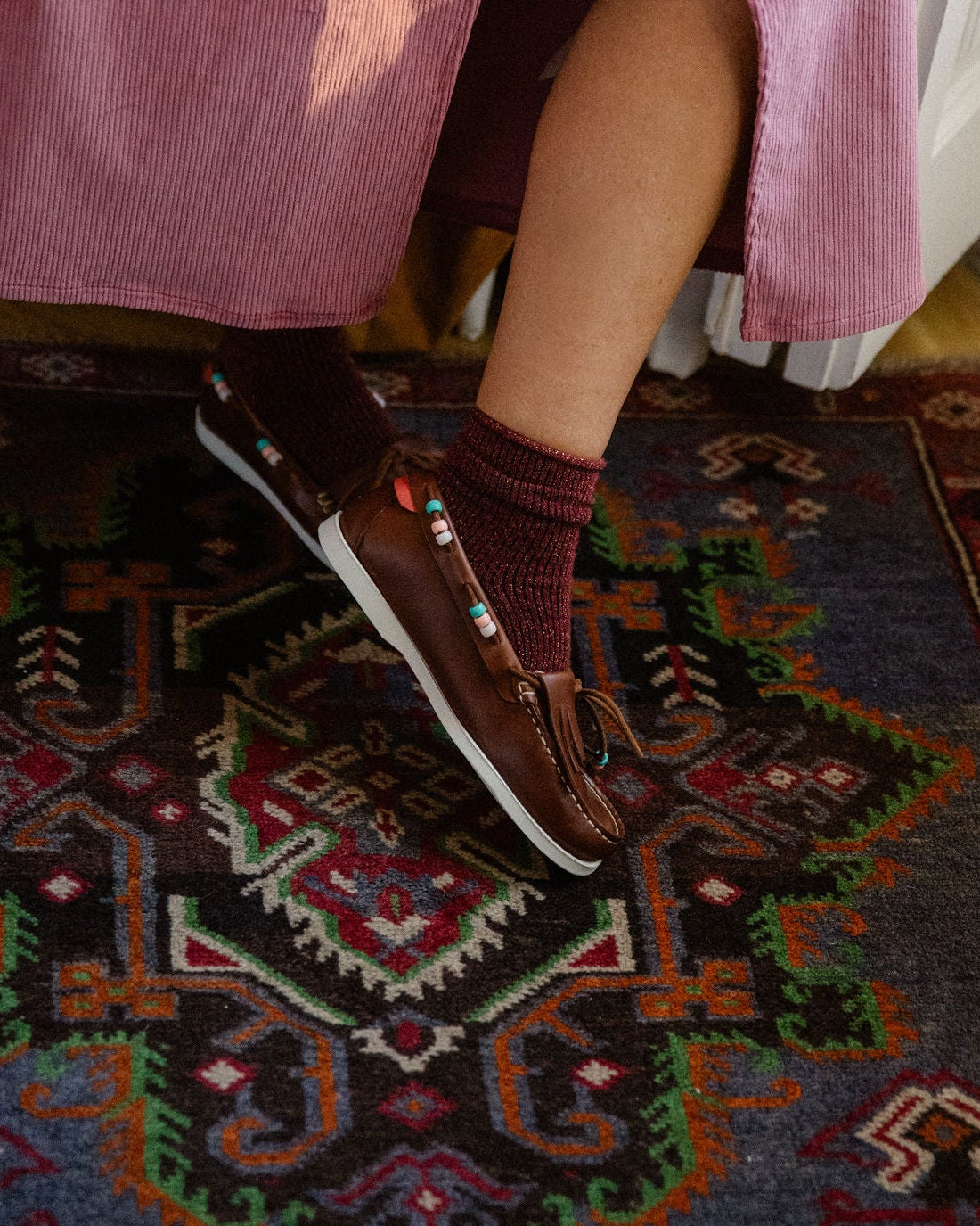 Herencia marinera con pespuntes cosidos a mano y lazo de cuero, a la que se suma un giro lúdico: lengüeta de flecos y el detalle icónico de la colaboración, las bolitas decorativas, colocadas una a una de forma artesanal. Cada par es ligeramente distinto, y en esas pequeñas variaciones vive su verdadera belleza: la del trabajo hecho con tiempo, cuidado y emoción.