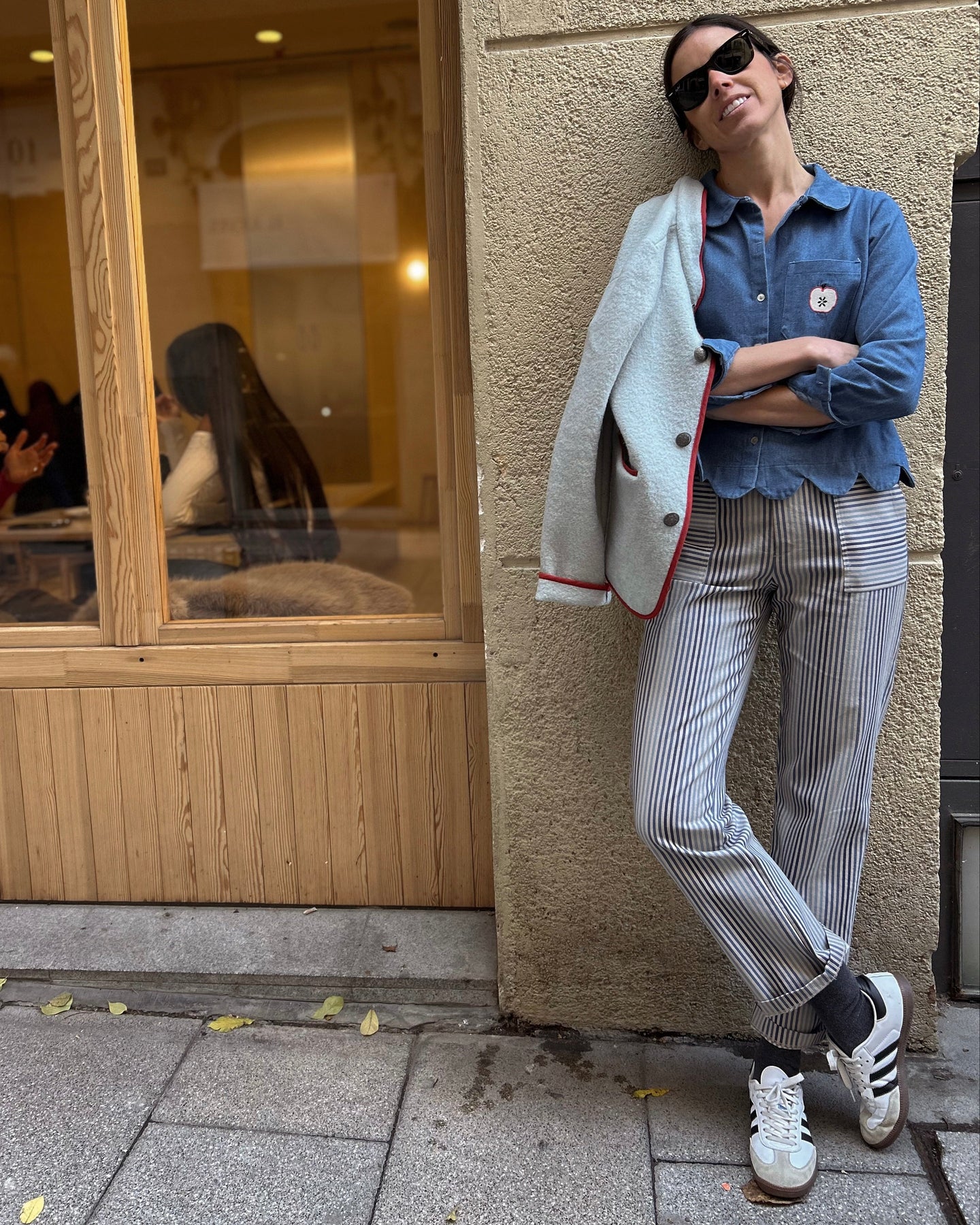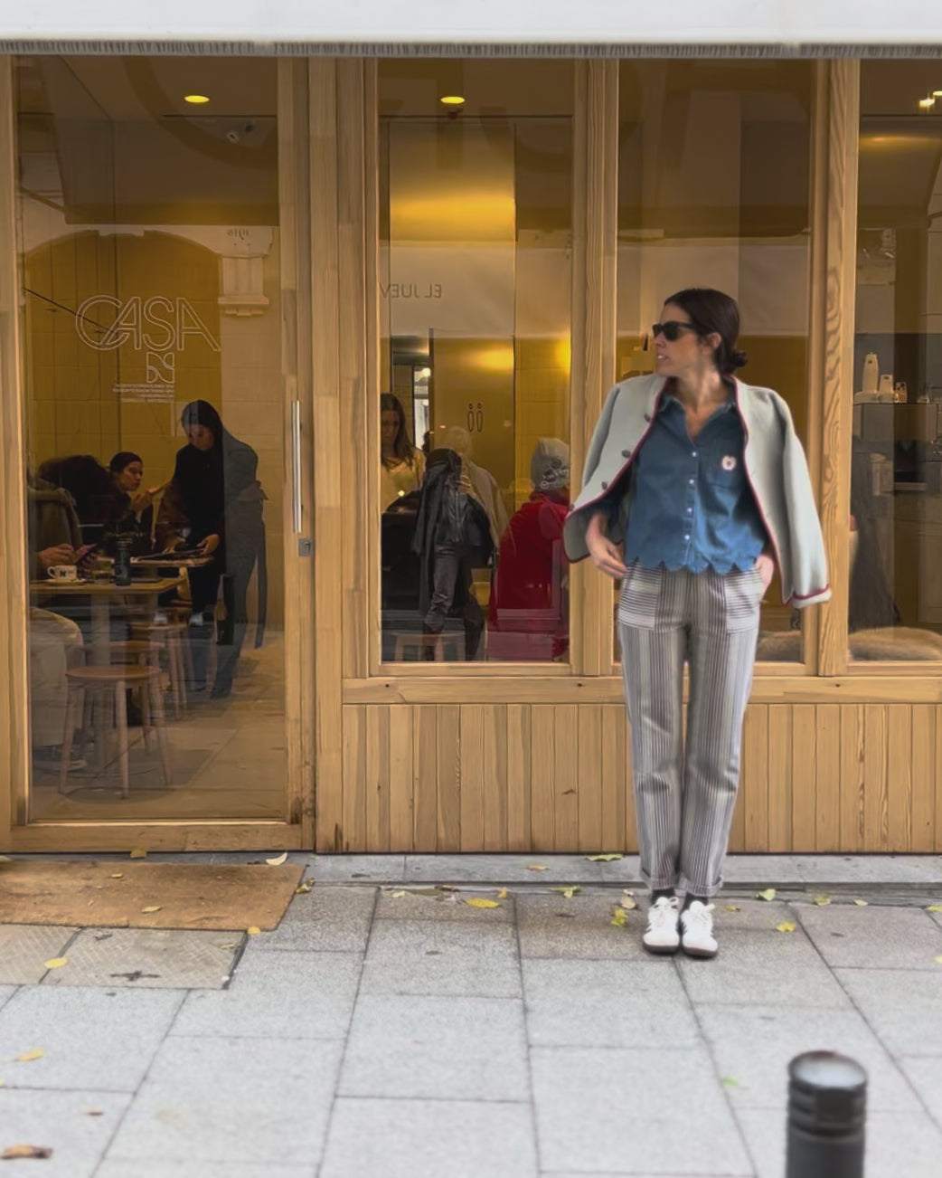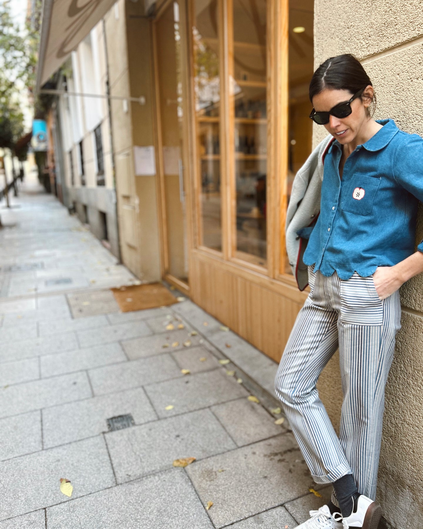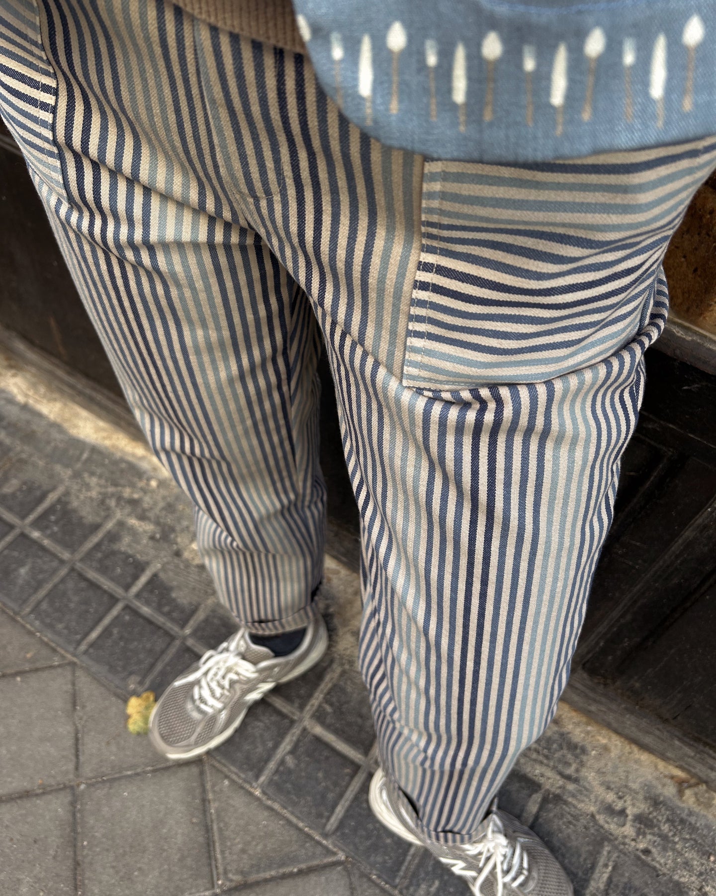 Rayas en tonos de azul sobre fondo piedra y corte clásico con bolsillos de parche.