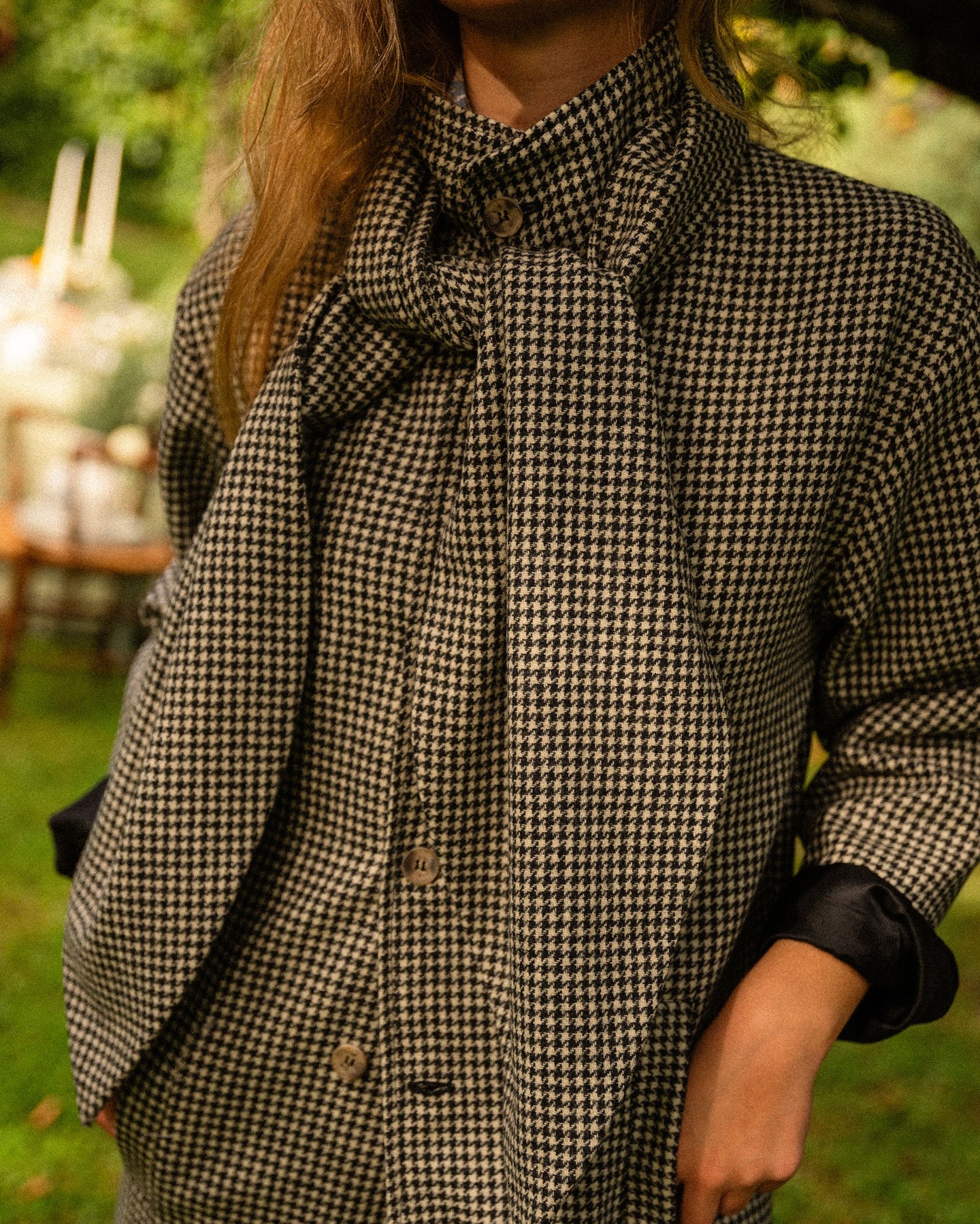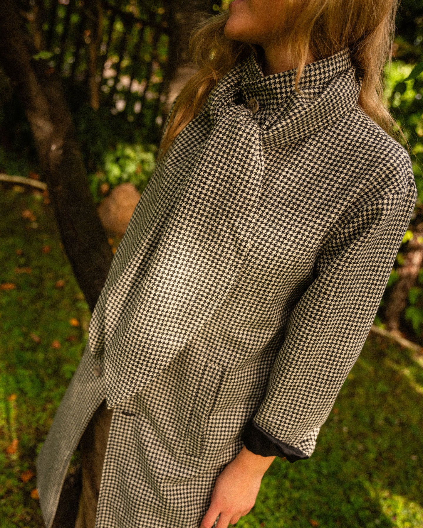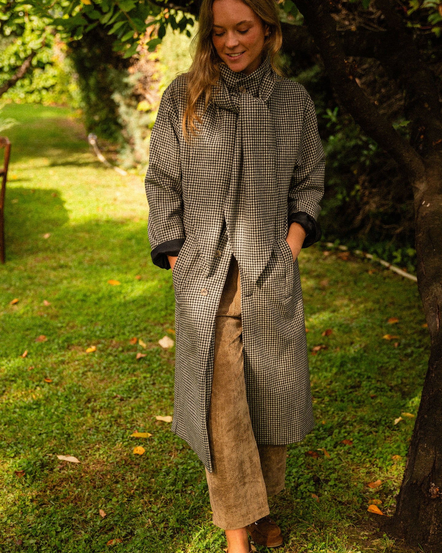 Abrigo discreto, elegante, especial. De corte recto, bolsillos y una lazada grande al cuello que se puede quitar.