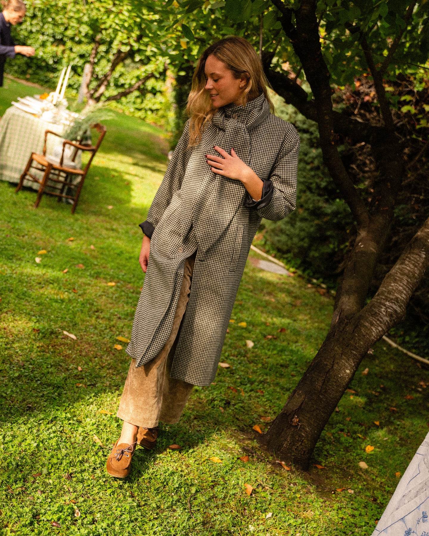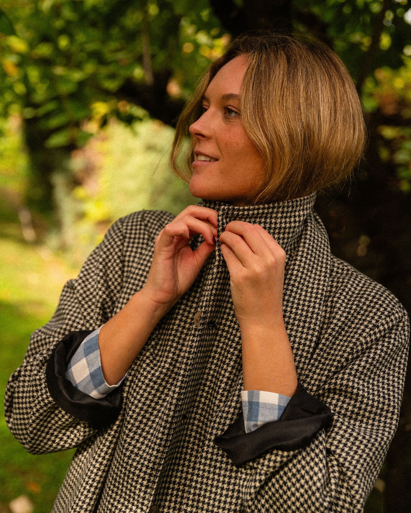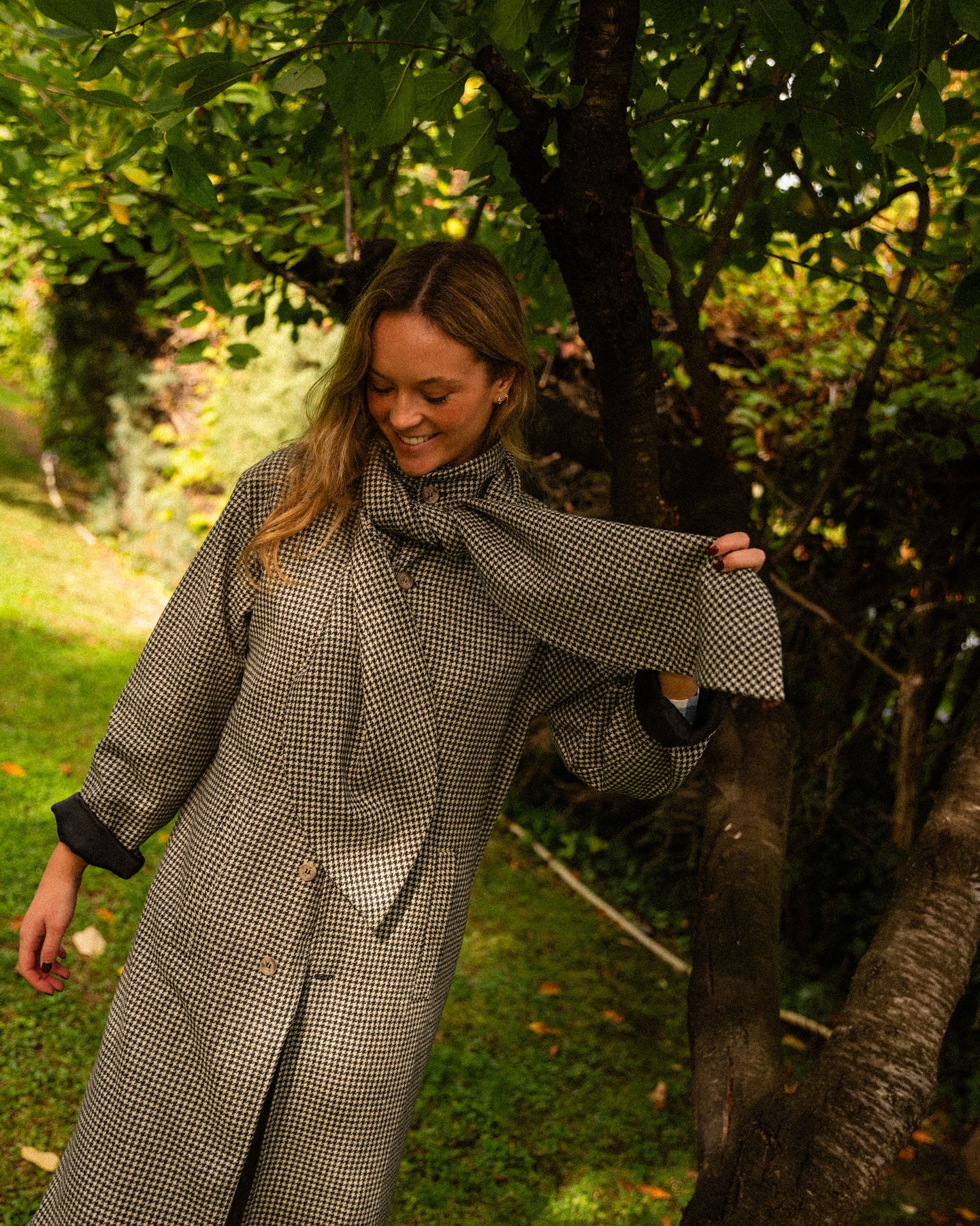Abrigo discreto, elegante, especial. De corte recto, bolsillos y una lazada grande al cuello que se puede quitar.