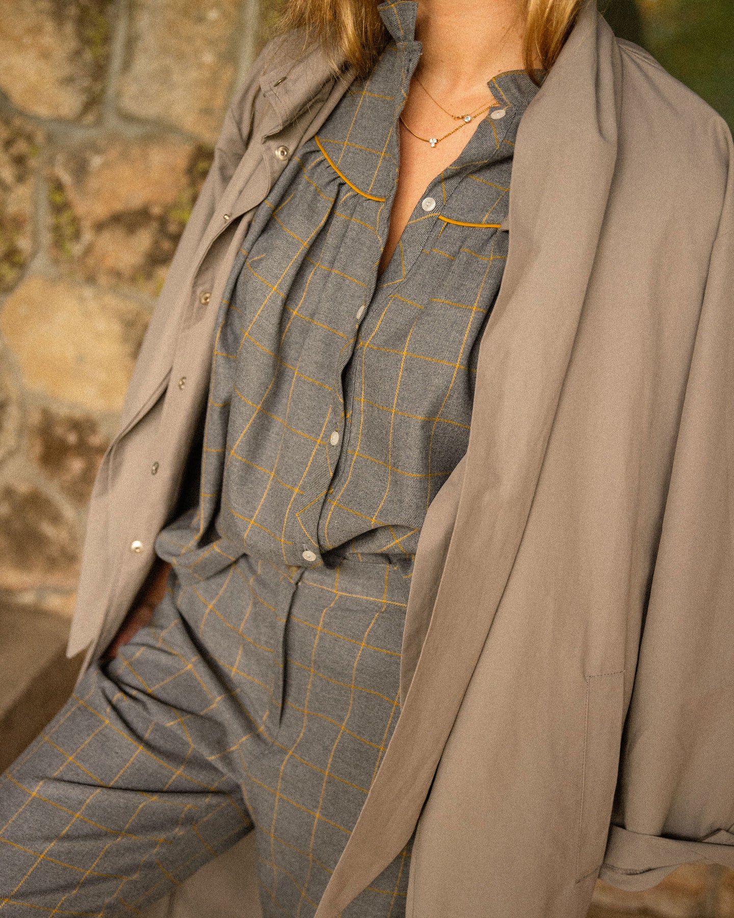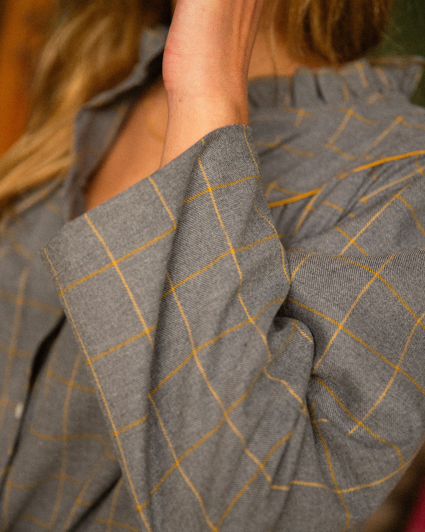 En discreto cuadro mostaza sobre fondo gris, esta blusita de patrón nuevo con canesú redondito, manga amplia sin puño y volante hacia arriba en el cuello es una monada que seguro os va gustar.