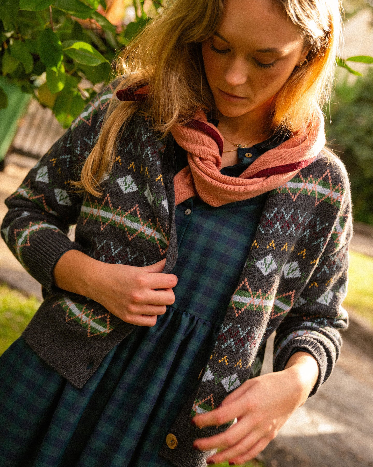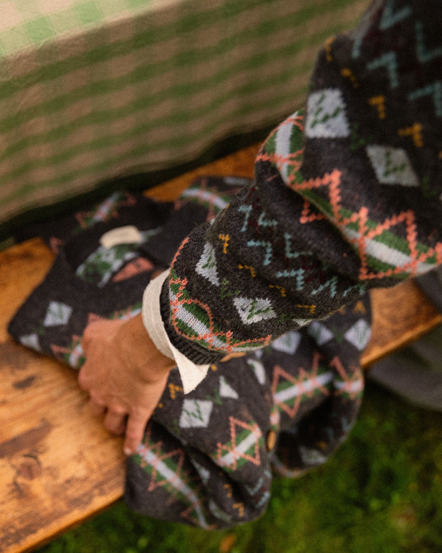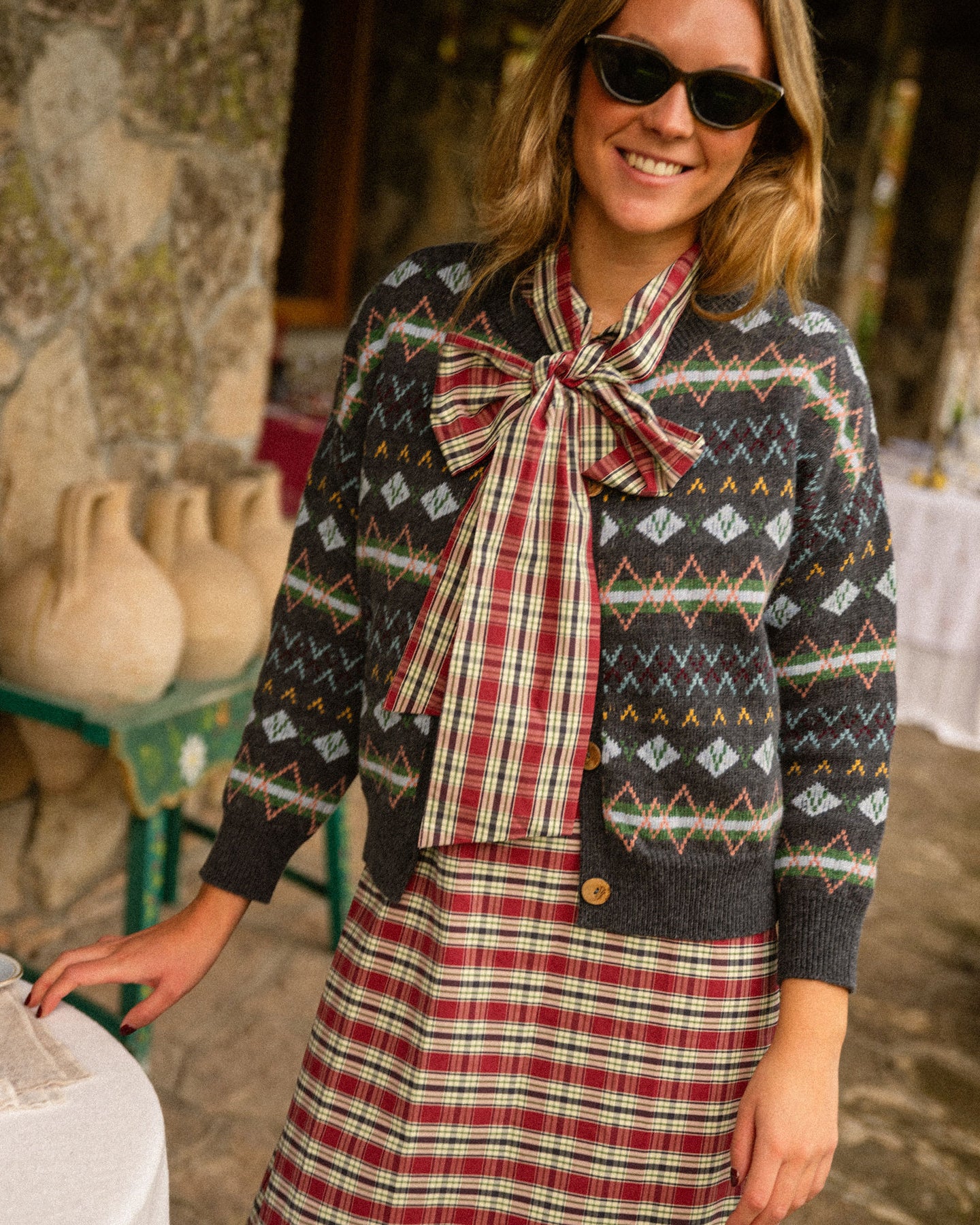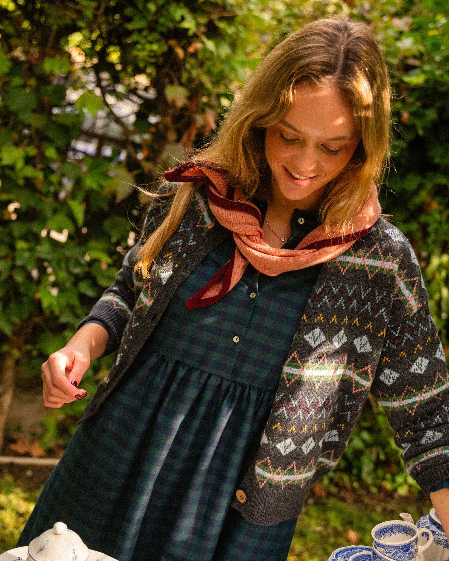 No existe una chaqueta más especial... De grecas de colores pastel sobre fondo gris marengo.