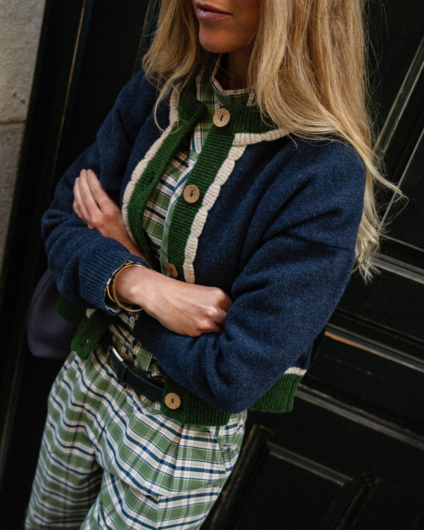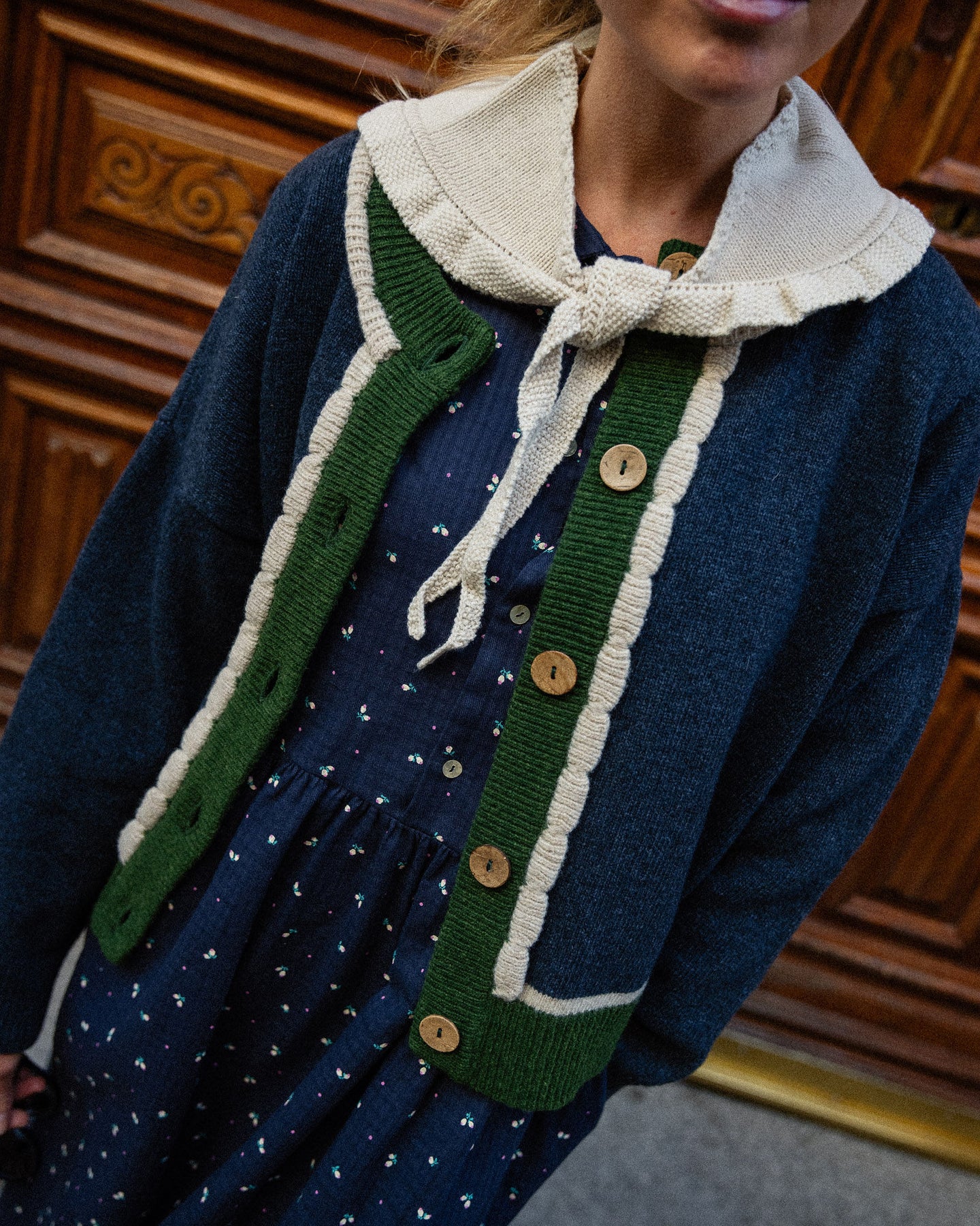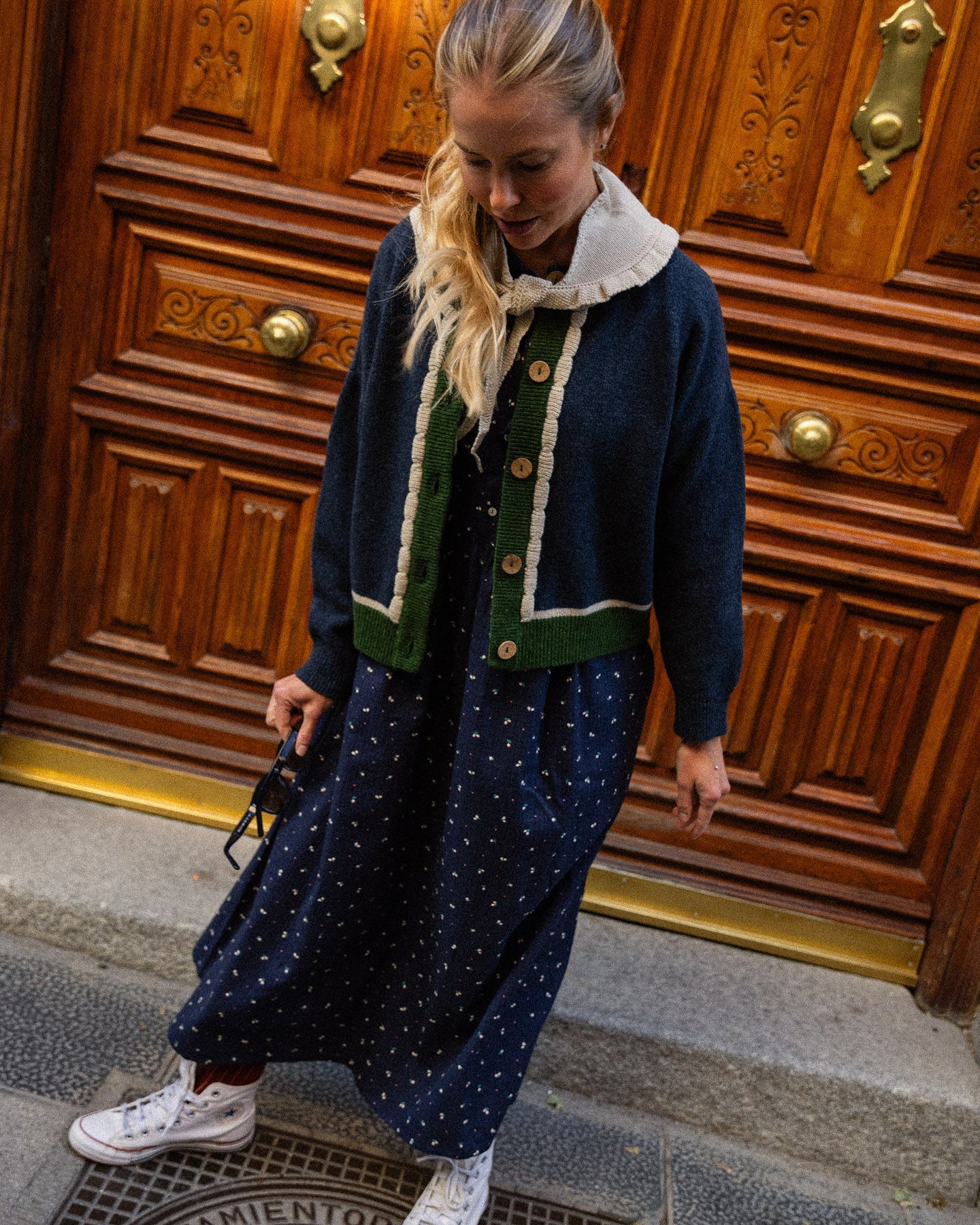 Una rebeca de ondas en tres colores: marino, botella y crudito, que va increíble con el resto de prendas de esta colección.