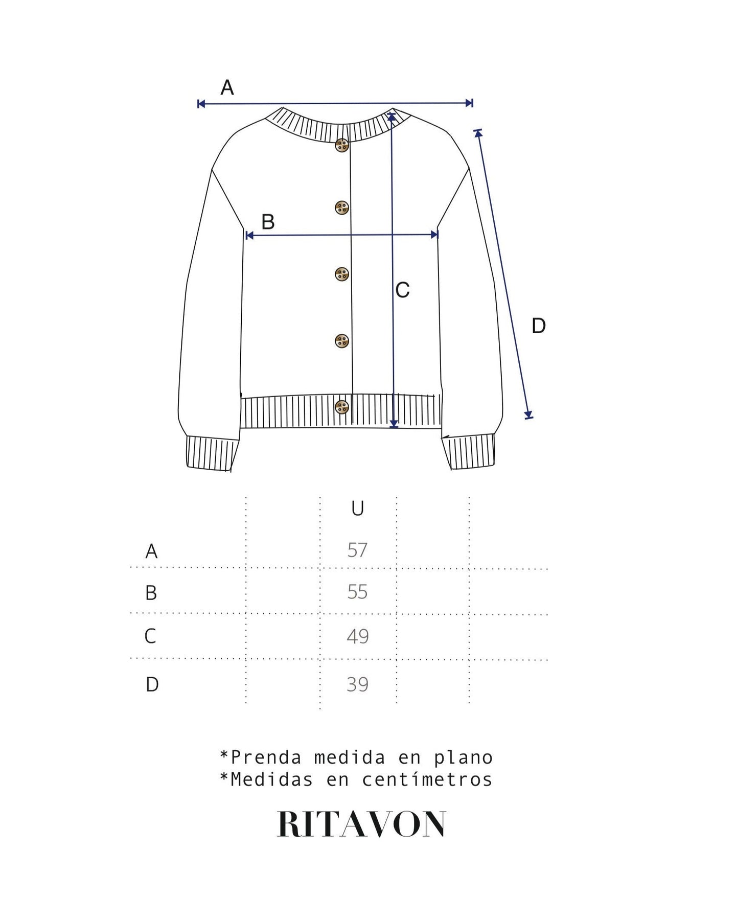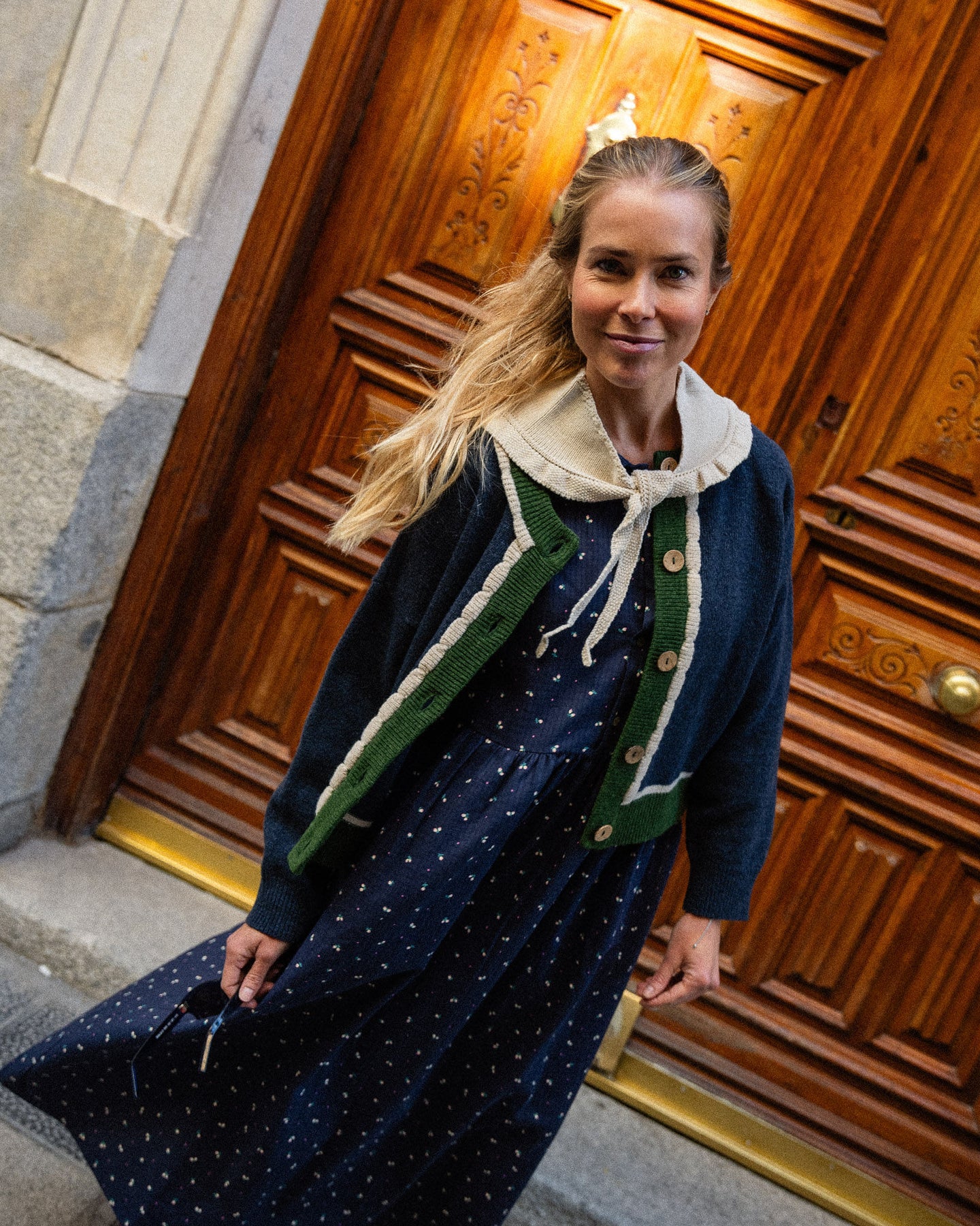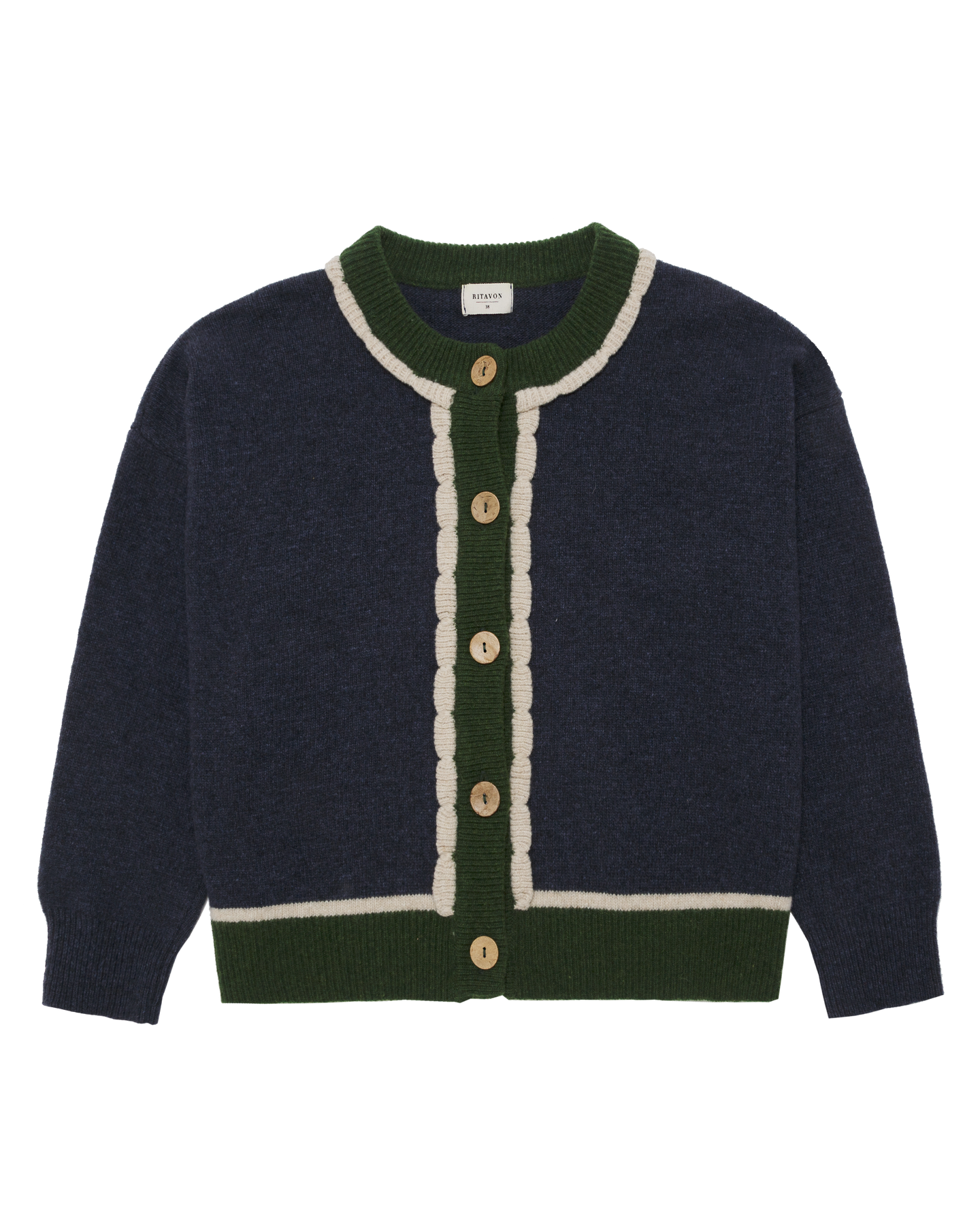 Una rebeca de ondas en tres colores: marino, botella y crudito, que va increíble con el resto de prendas de esta colección.