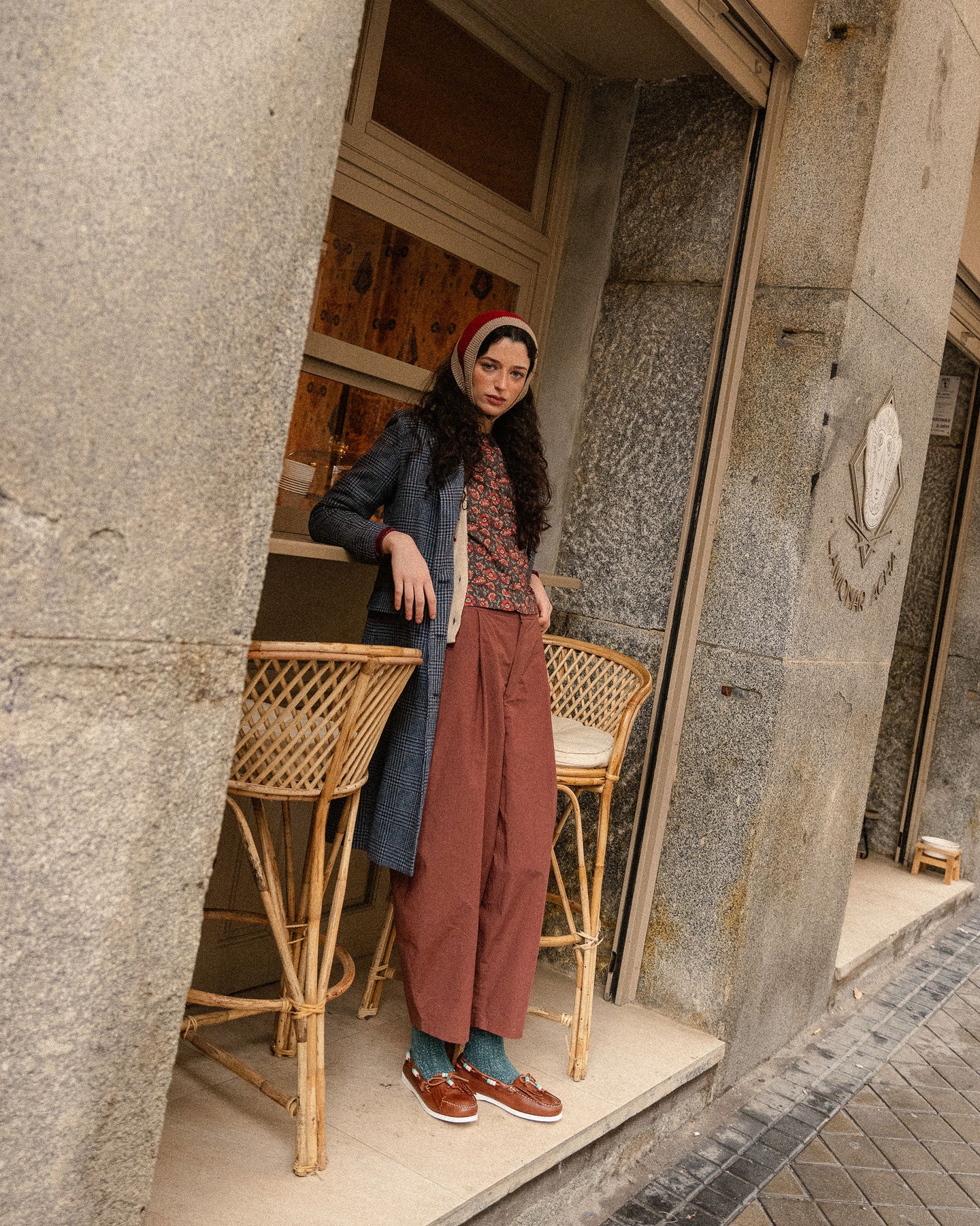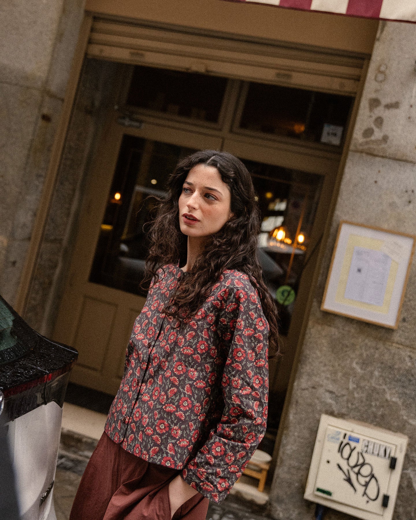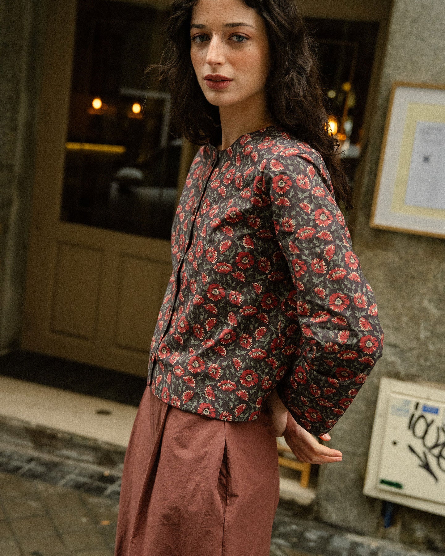 Para amantes de Libertys oscuros, este top color chocolate con flores burdeos.