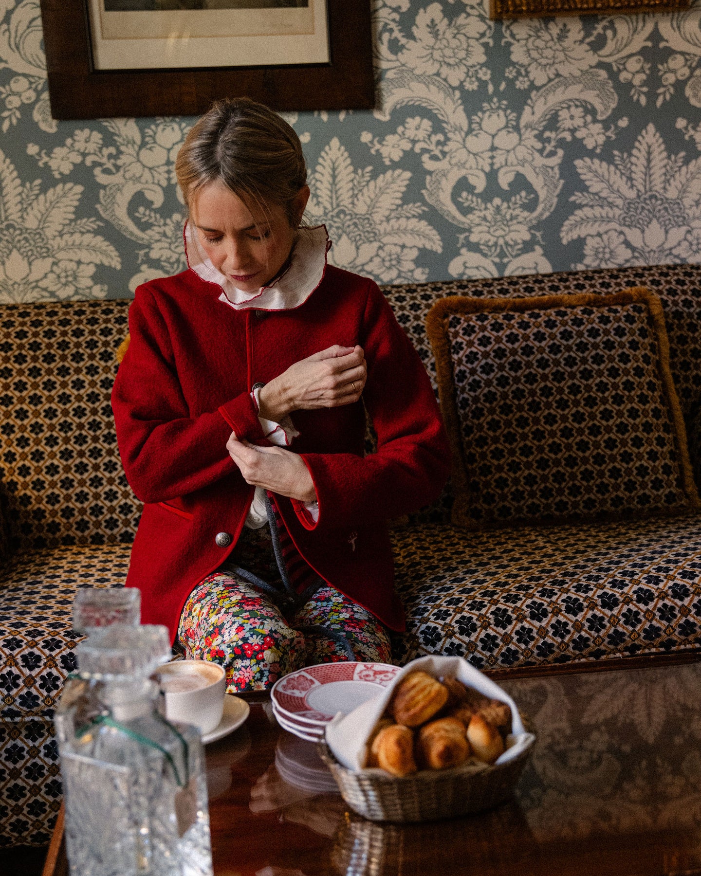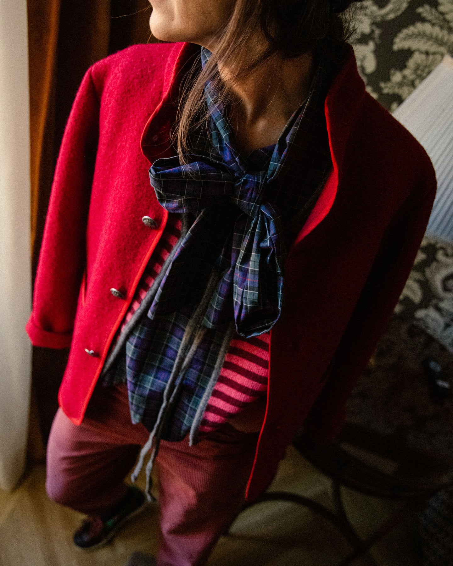 Austriaca de lana roja con una 🍄 bordada en uno de los bolsillos.