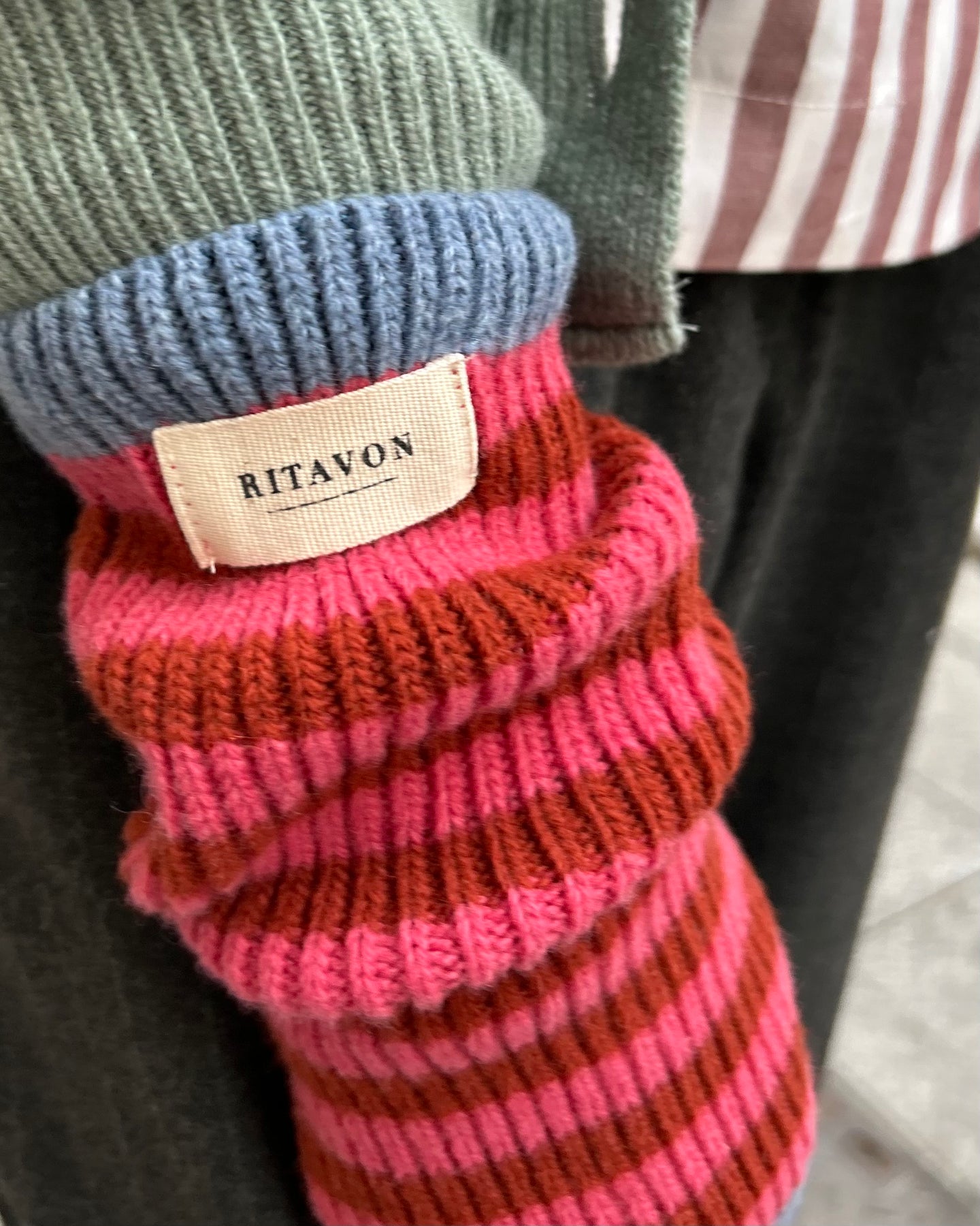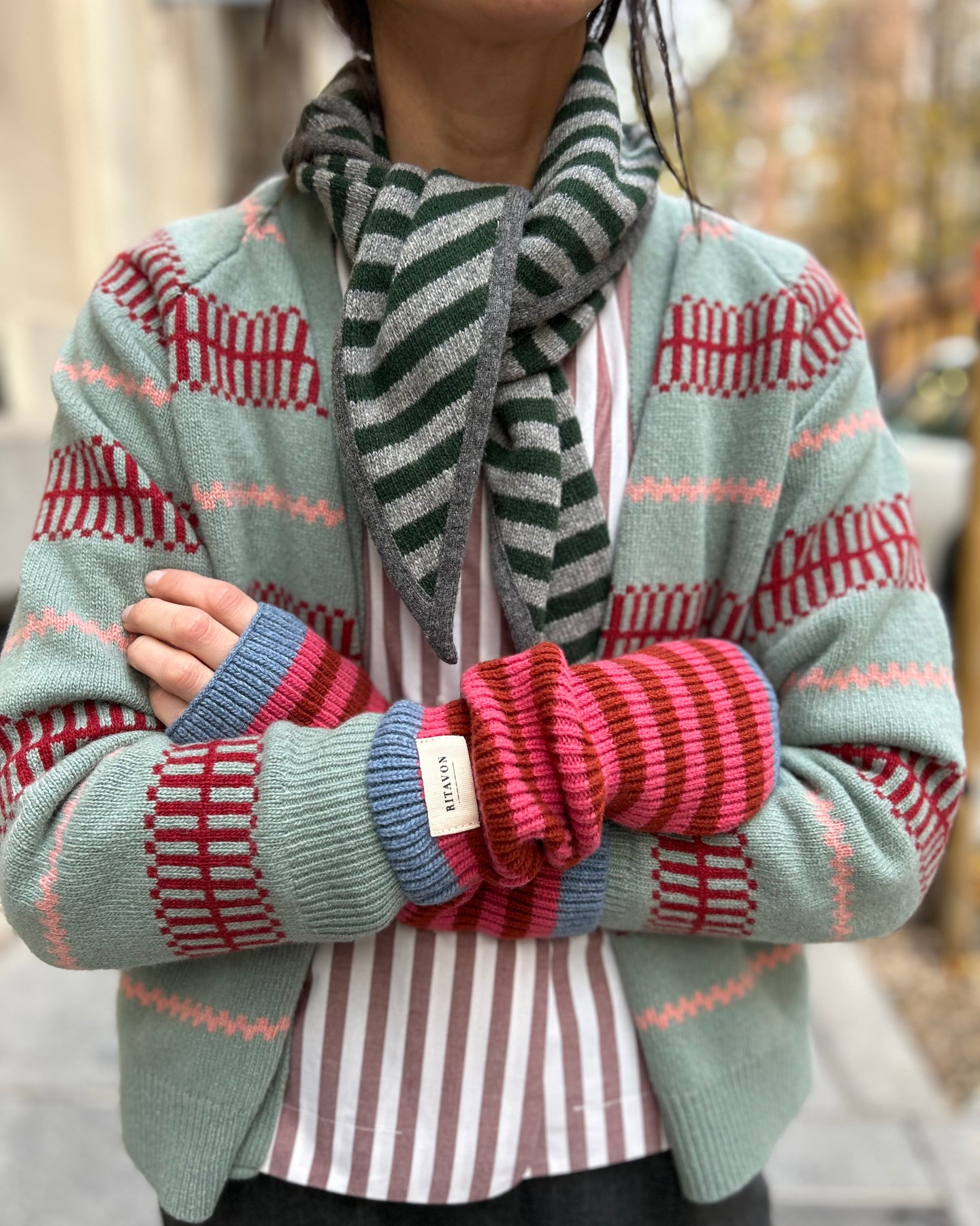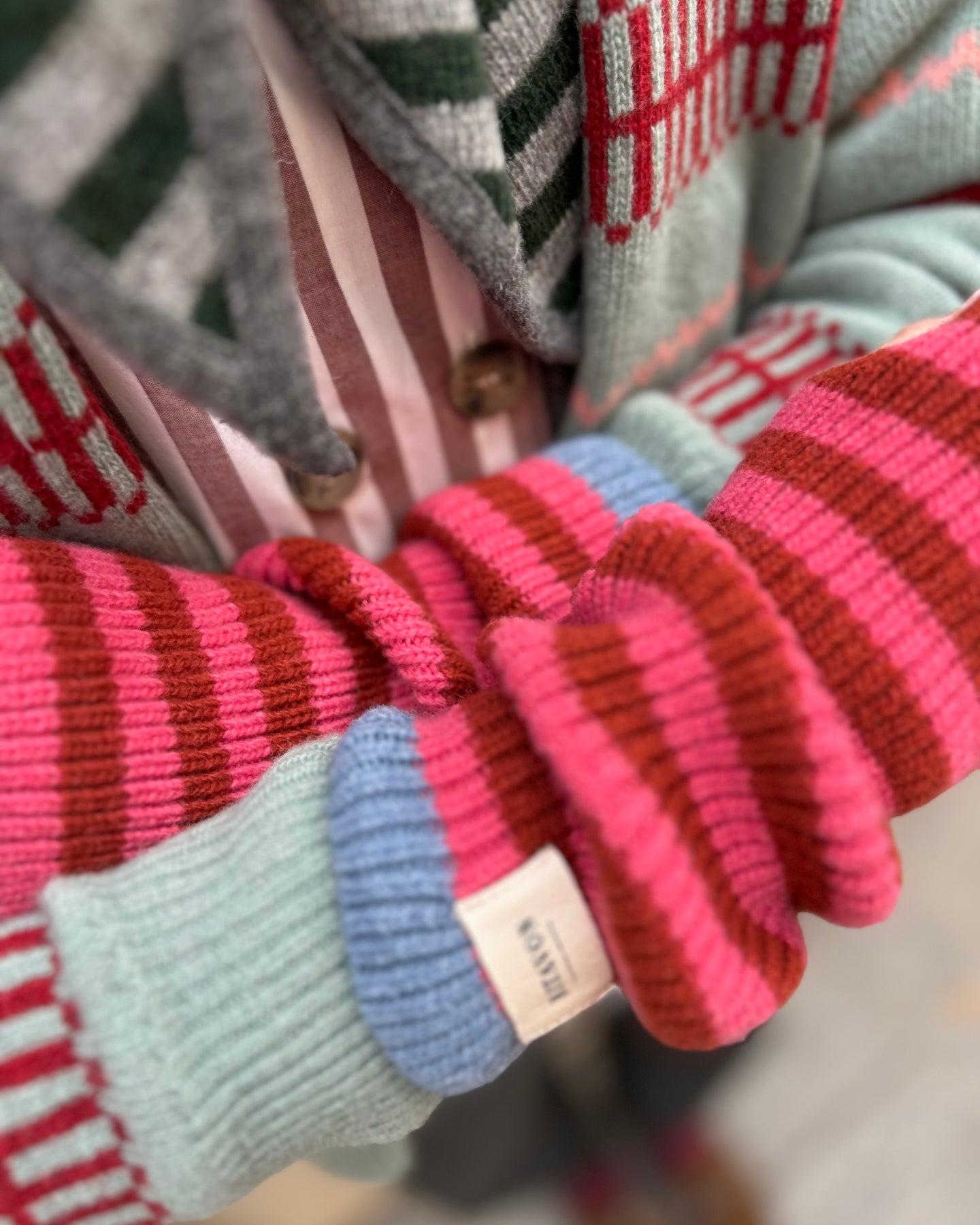 Nuestros mitones son ideales... Rayas fresa y burdeos con borde azul.