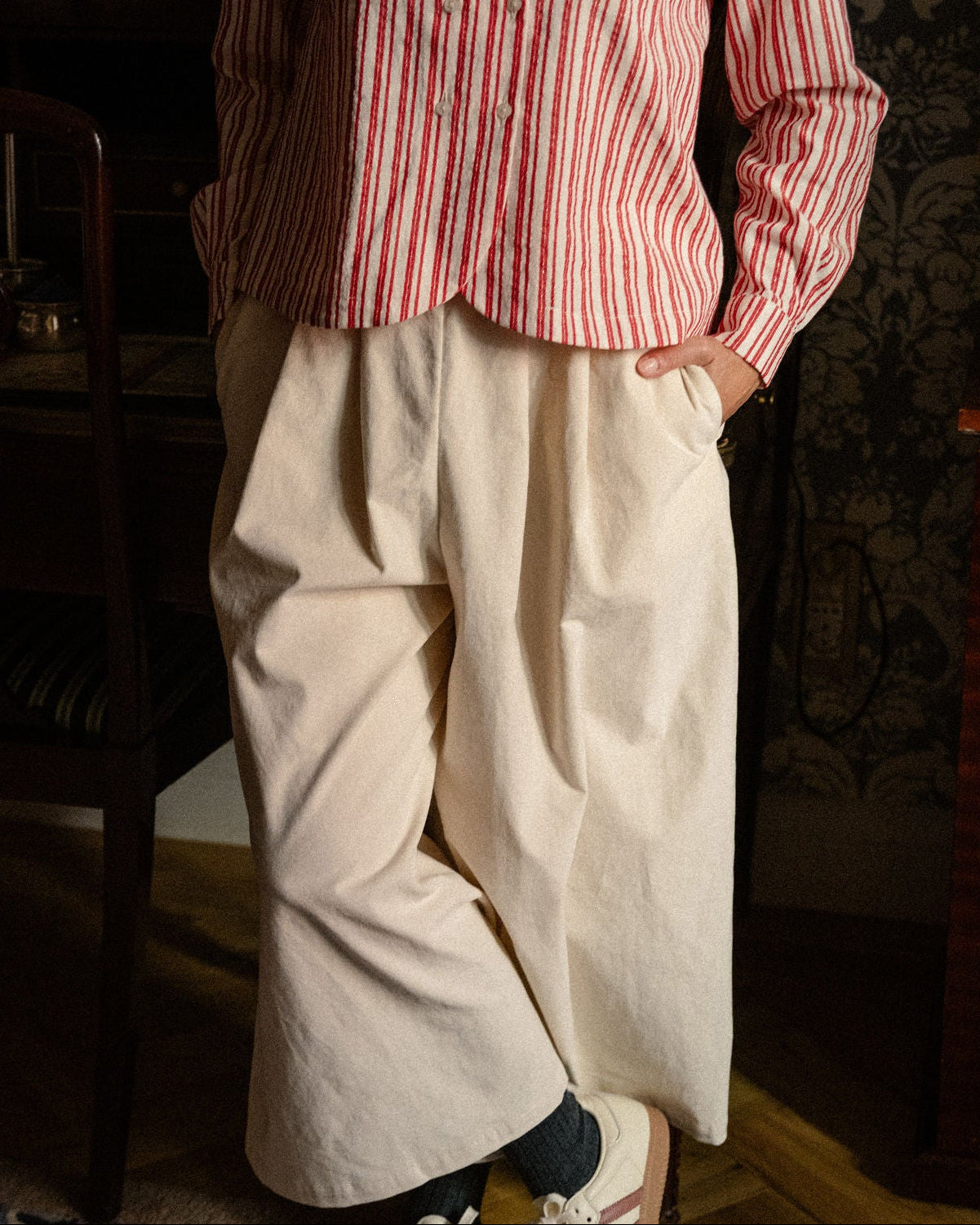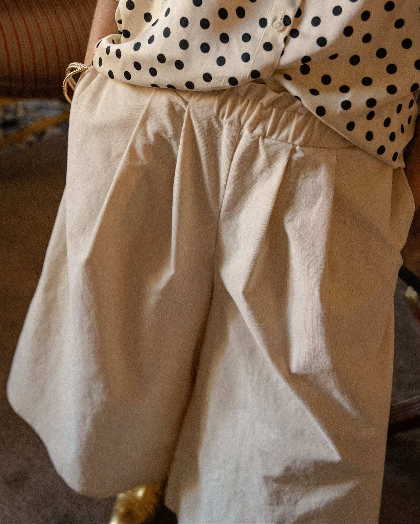 En suave micro pana color crudito, este café de elástico en cintura y bolsillos es un fondo de armario perfecto.